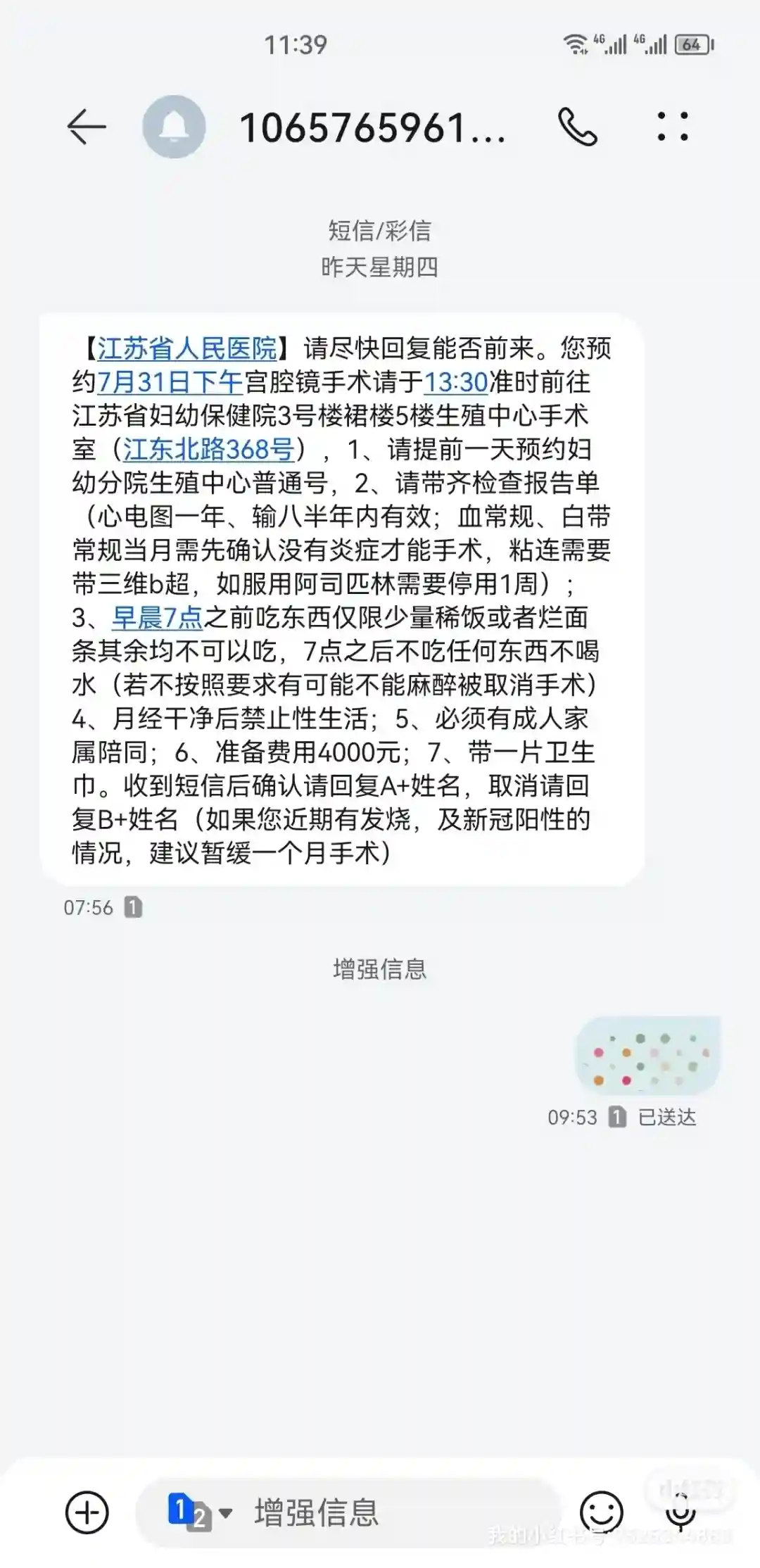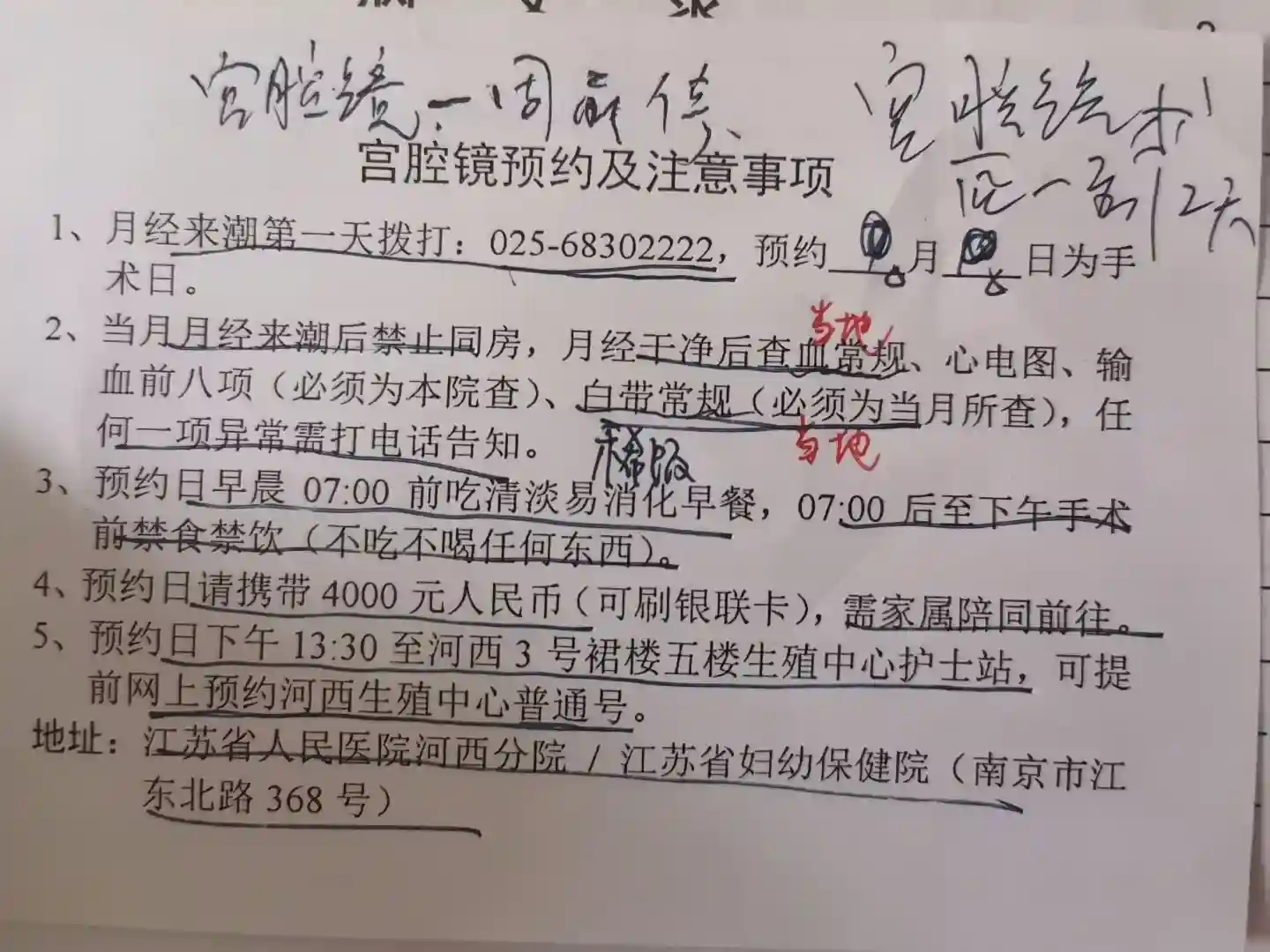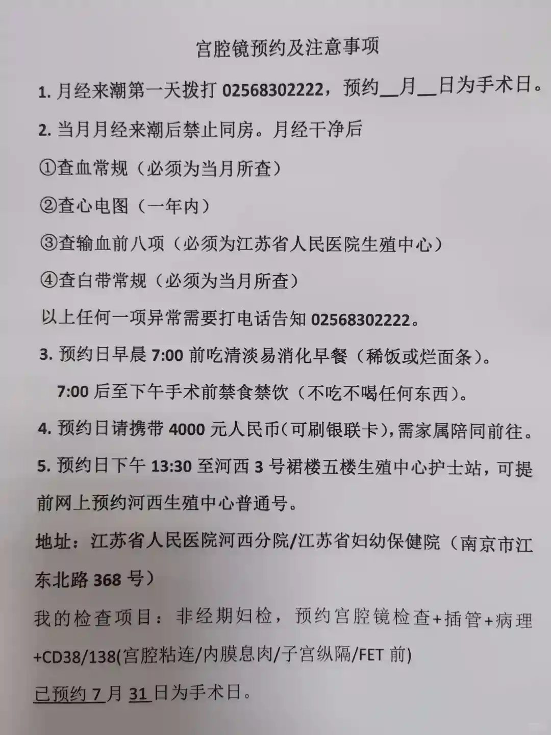 我今天的检查时间不是最好的时间,月经7.11-7.19结束,最好的检查时间是月经结束2-7天,建议姐妹们如果要做宫腔镜检查手术,可以在医生开单子以后就预约,我就是等月经来了以后才打电话02568302222预约,医院已经预约满了排不进去,把自己坑了,我又不想再等下个月,这次52天才来一次月经,如果月经不准再等又要浪费我两个月时间。
