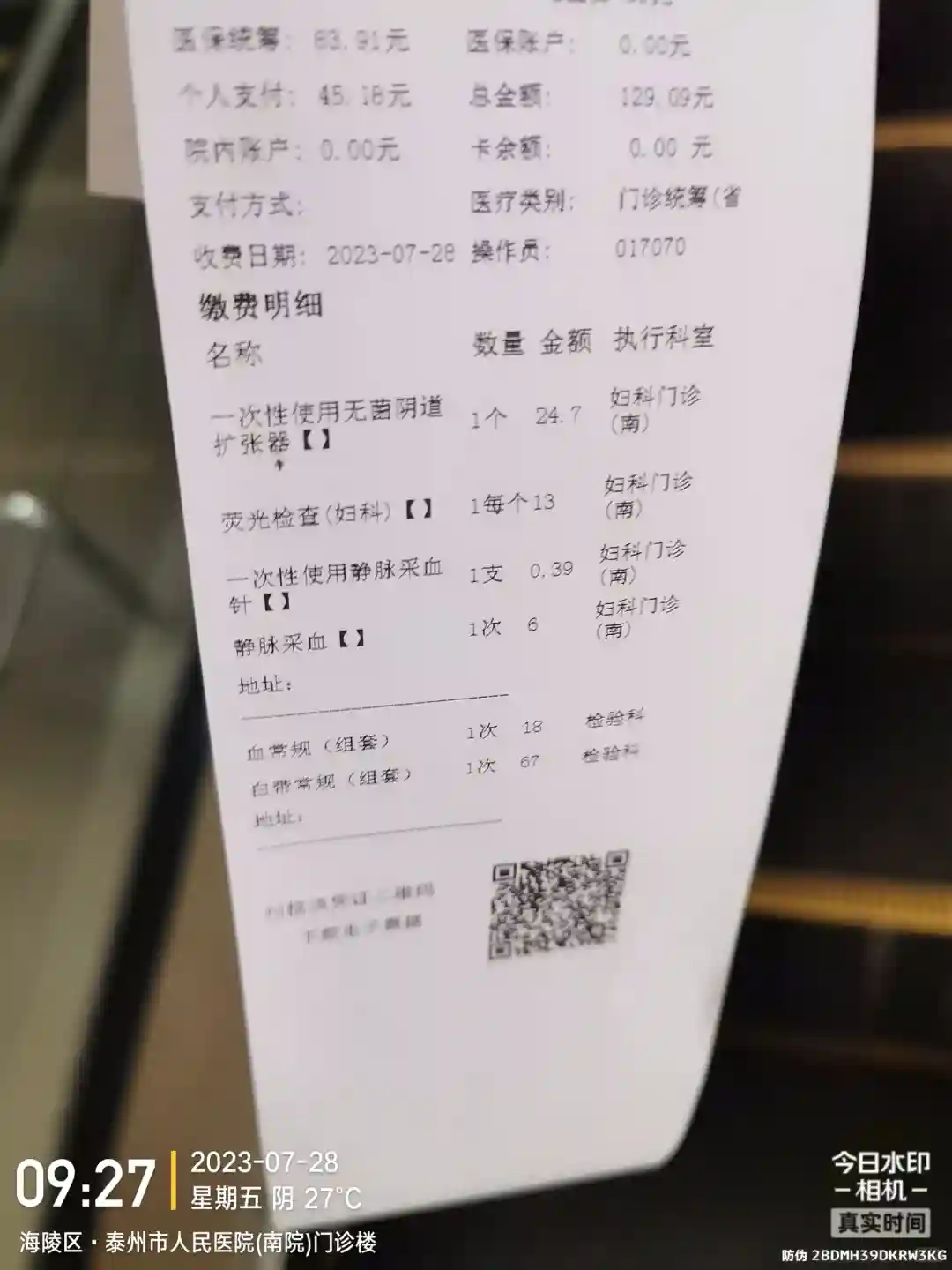 ③④血常规、白带常规:7.28在泰州人民医院检查了白带常规和血常规总金额129.09元,门诊统筹83.91元,自己付款45.18元 。