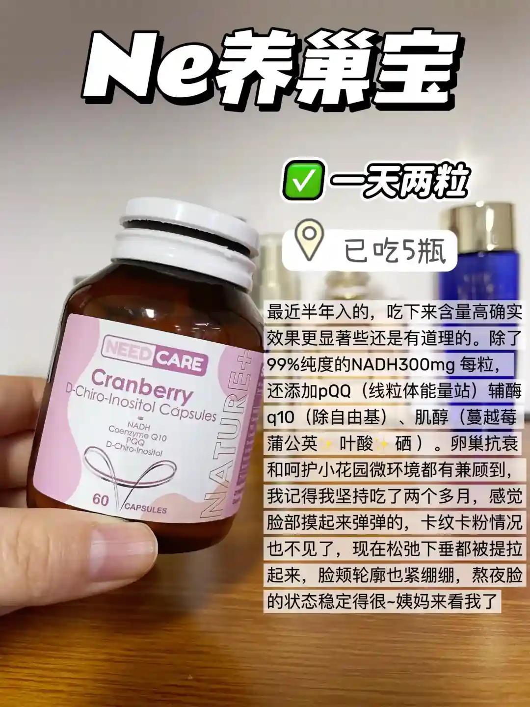 半年一直就是养巢宝了,单粒就有300mgNADH 酶q10含100mg 还有40mg的pqq,,含量算业内拔尖水平了,加上天然蔓越莓 肌醇 叶酸的加持,现在只涂基础打底皮肤就很干净透亮,而且坐那小肚子也没那么明显了hh~ 预计今天来大姨妈,下午的时候已经到了,几乎没有再推迟过~