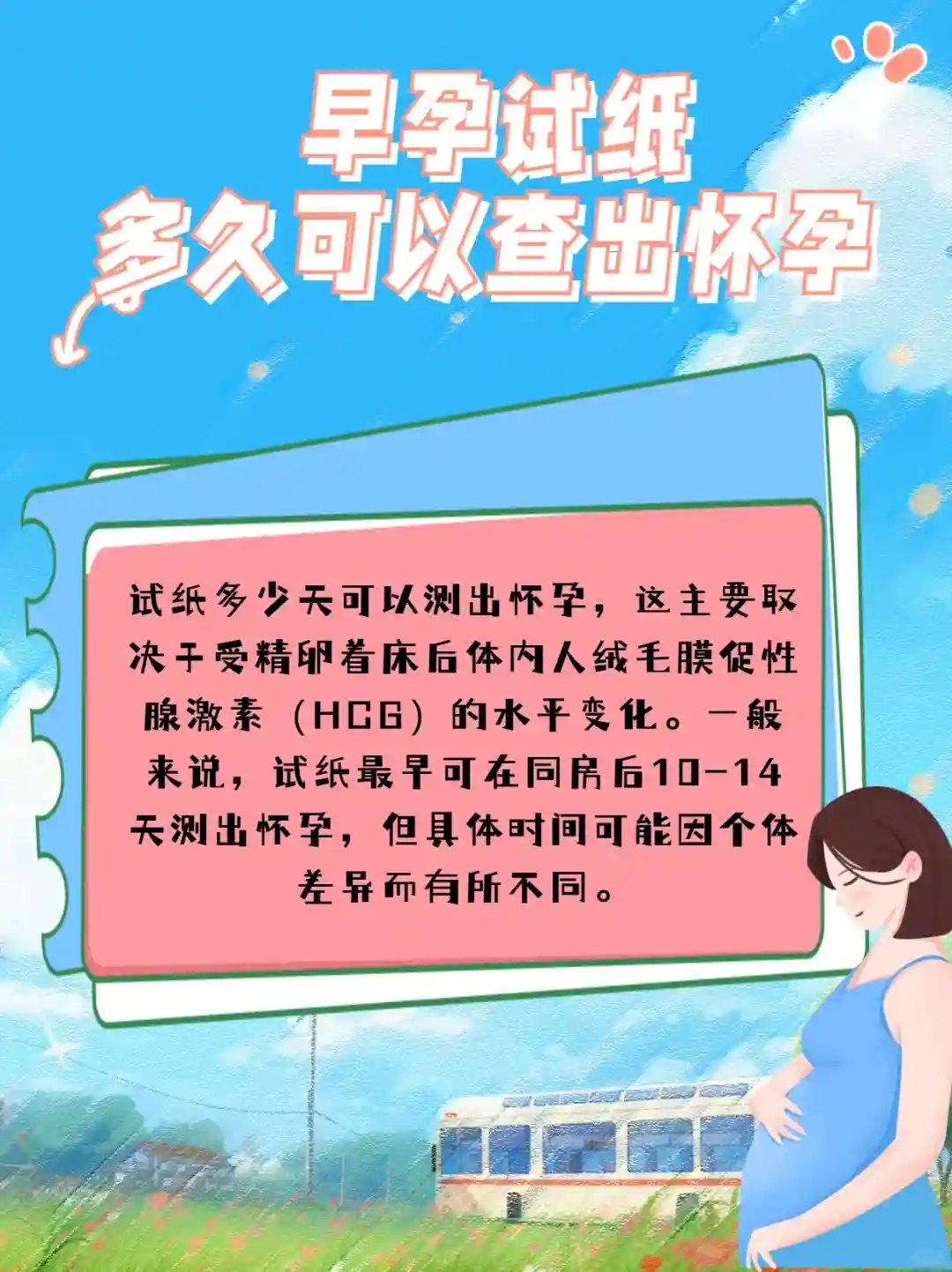 试纸多少天可以测出怀孕,这主要取决于受精卵着床后体内人绒毛膜促性腺激素(HCG)的水平变化。一般来说,试纸最早可在同房后10-14天测出怀孕,但具体时间可能因个体差异而有所不同。