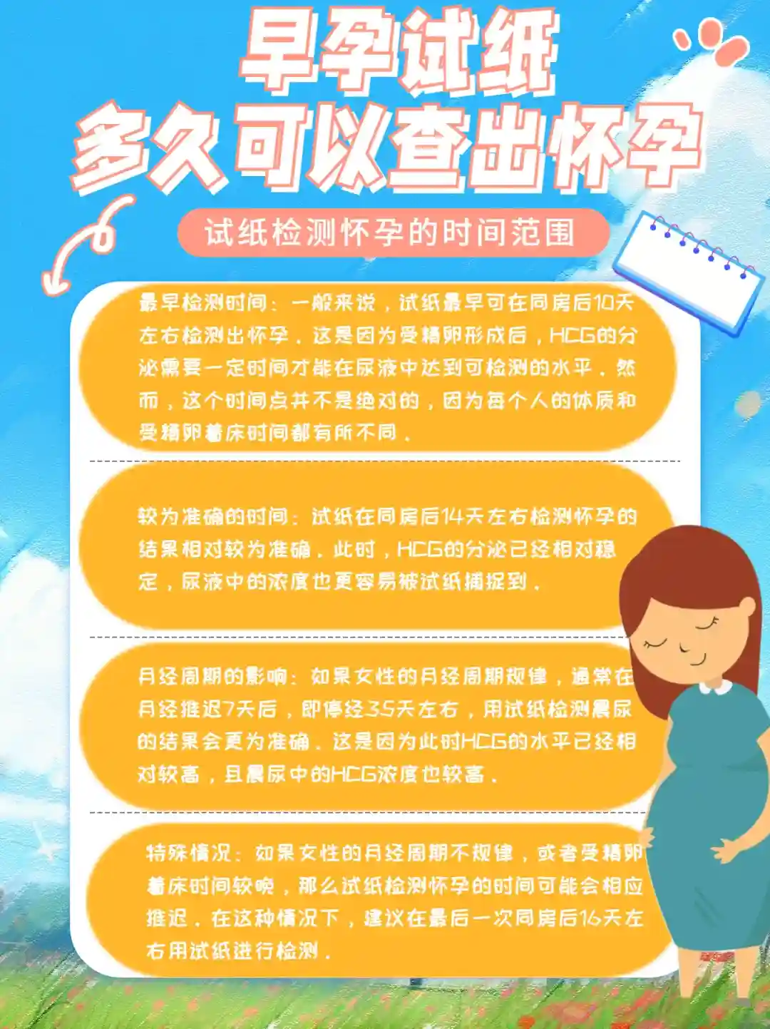 特殊情况:如果女性的月经周期不规律,或者受精卵着床时间较晚,那么试纸检测怀孕的时间可能会相应推迟。在这种情况下,建议在最后一次同房后16天左右用试纸进行检测。