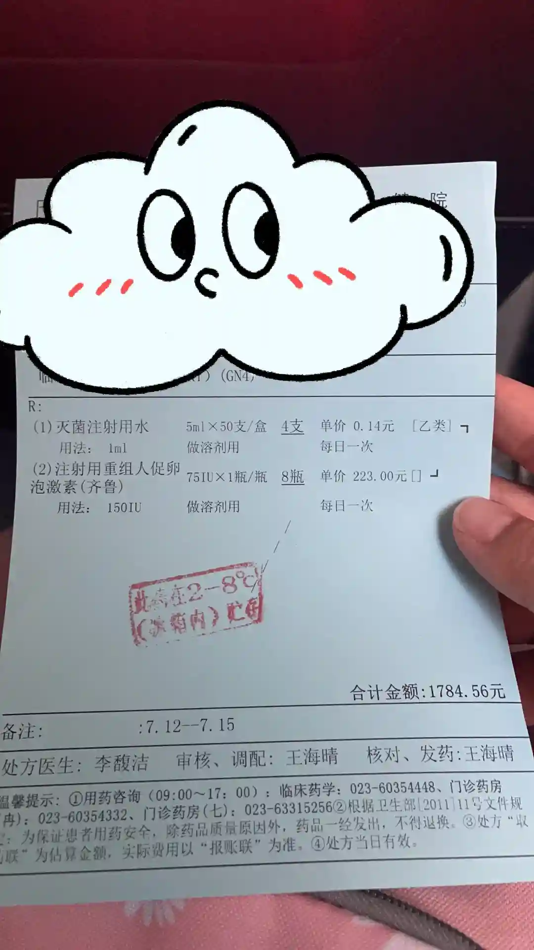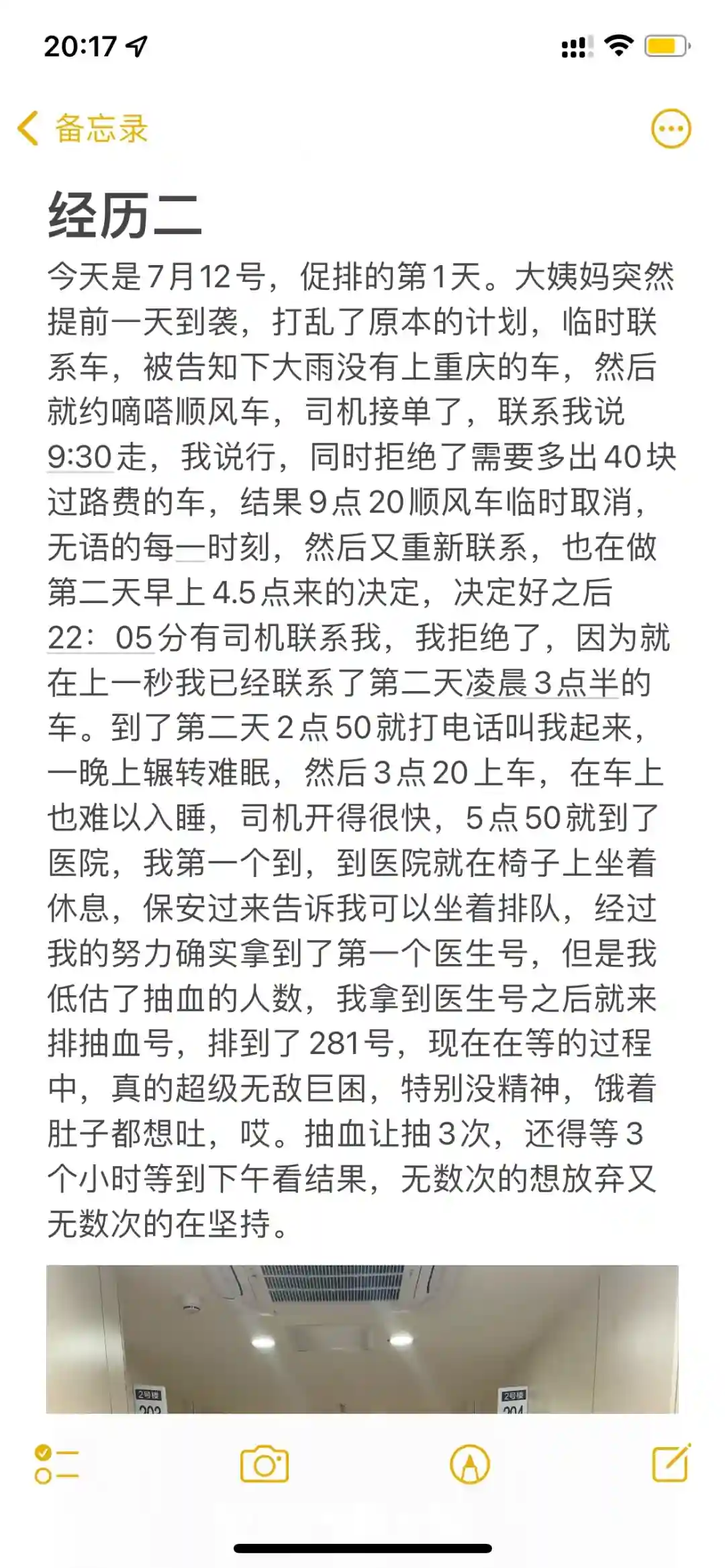 就是为了#进周 我5点50就到了医院,我第一个到,到医院就在椅子上坐着休息,保安过来告诉我可以坐着排队,经过我的努力确实拿到了第一个医生号,但是我低估了抽血的人数,我拿到医生号之后就来排抽血号,排到了281号,现在在等的过程中,真的超级无敌巨困,特别没精神,饿着肚子都想吐,哎。抽血让抽3次,还得等3个小时等到下午看结果,今天做了超多检查,也是超级郁闷心态崩溃的一天,所以就还是需要队友时刻在身边,说说话也好,等到下午把所有的检查都给医生看了没问题了之后,就会安排进周,然后就开始打针,医生会根据基础卵泡和身体情况选择方案,我是#拮抗剂方案 打的国产#齐鲁 ,每天打2针,223元/针,打4天,第五天看b超情况和激素之后再开药。要准备冰包和冰袋,因为这些药必须要冷藏2—8°C保存,而且第一针必须在医院打,后面的三针可以在家或者附近诊所打,今天就算是结束,我就是在无数次的想放弃又无数次的坚持。