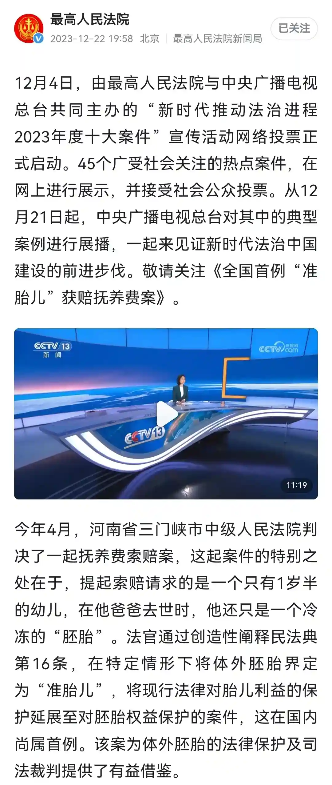 准予特定条件下体外胚胎享有胎儿权利,案件的判决体现了司法机关在解决人类生殖技术所涉法律纠纷方面的有益探索。该案的判定既尊重了生命权,同时也遵循儿童利益最大化法律原则,是对未成年人利益进行更为全面的法律保护和救济。面对新问题,司法裁判既要符合法律精神,又要有温度和力量,维护群众的合法权益。办理此案的法官,结合未成年人利益和核心诉求与民法典的立法本意,在办案中得到充分体现。#准胎儿获赔抚养费 #胎儿权利 #生命权#未成年人利益