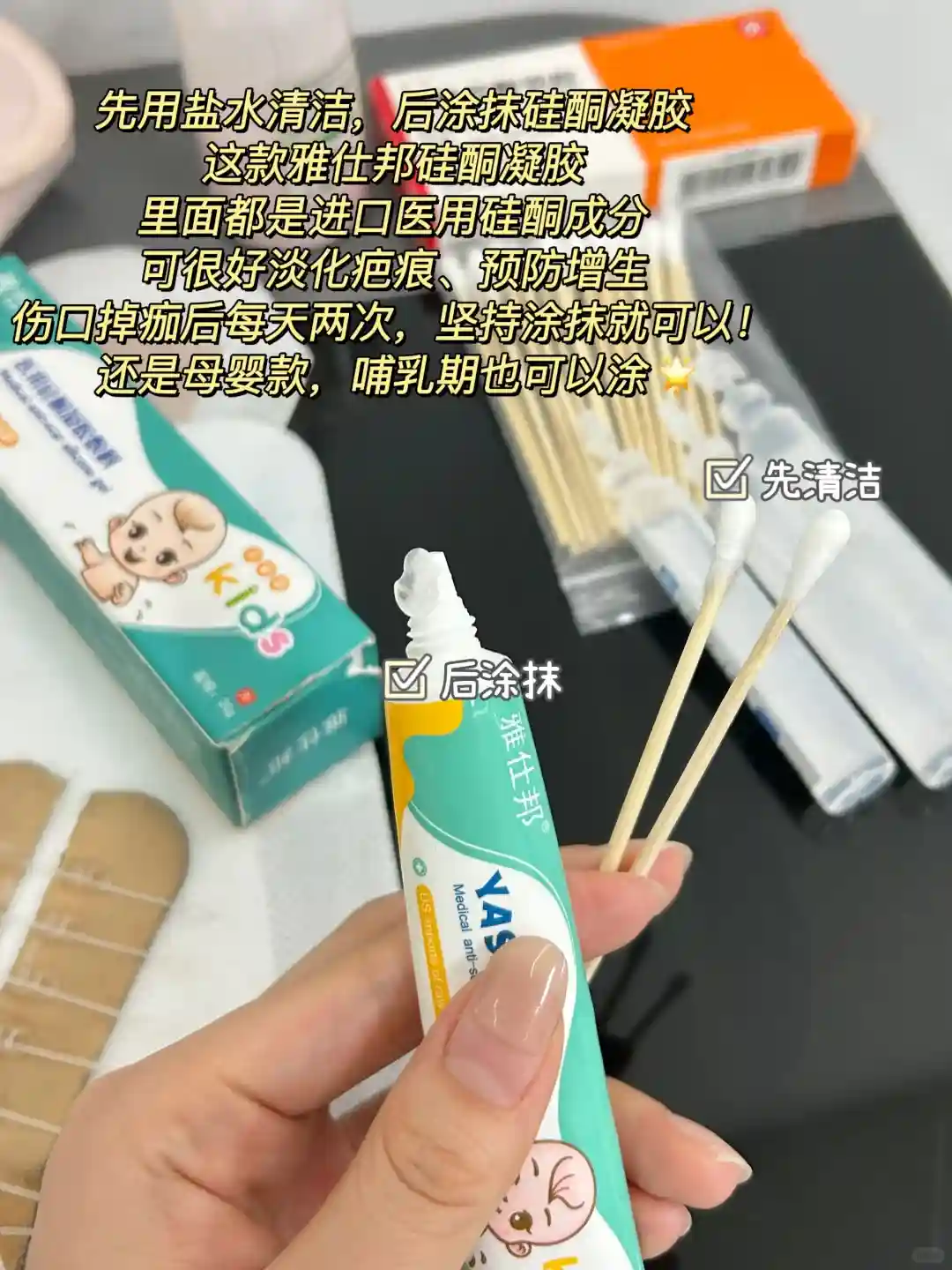 ✅雅仕邦硅酮凝胶:伤口结痂脱落后,可以用含有医用硅酮的祛疤膏祛疤,这个雅仕邦硅酮凝胶就是,可以很好的淡化疤痕,抑制增生,坚持涂了一段时间,疤痕就淡了!