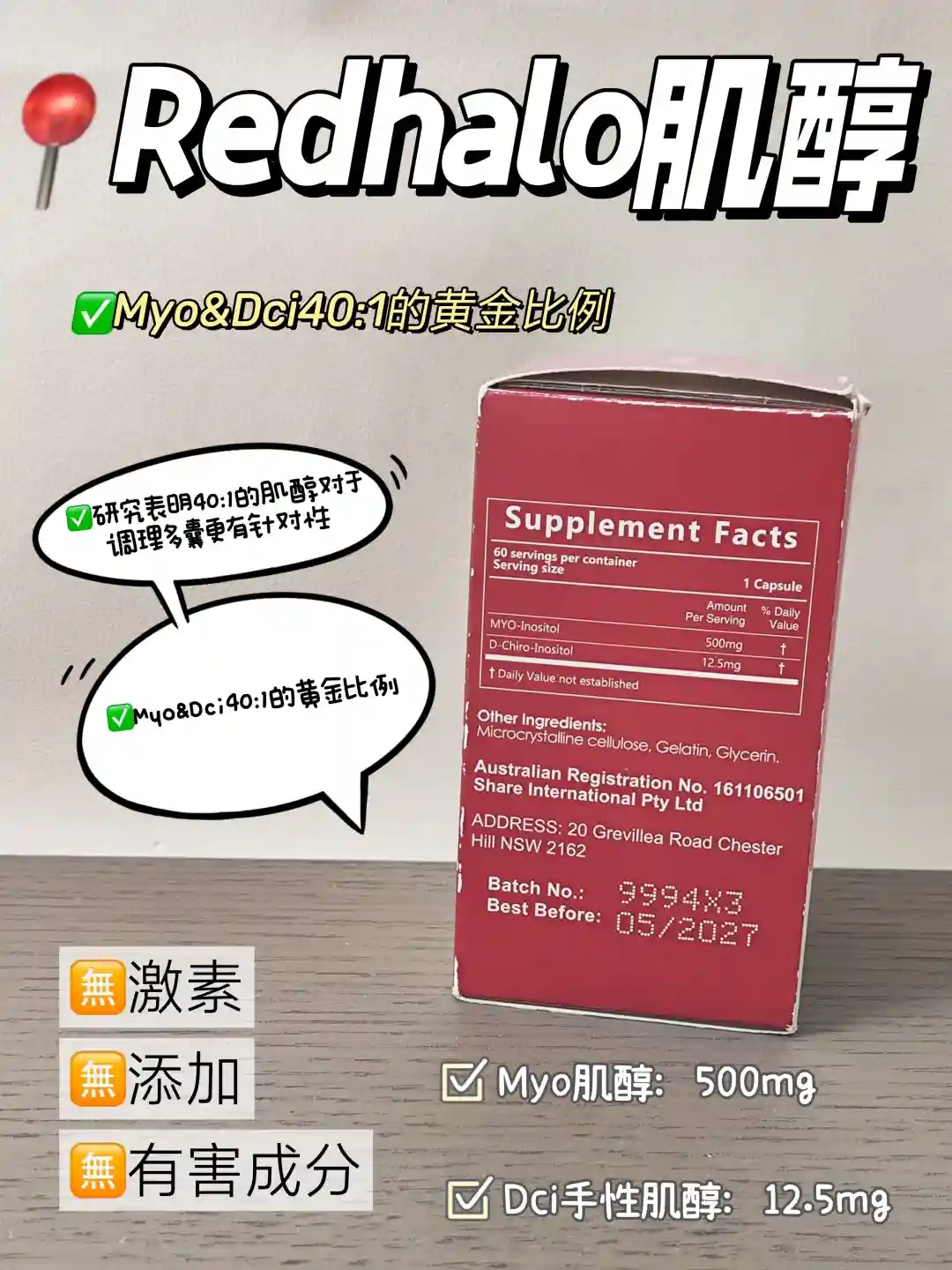 ⭕内服调理,肌醇本质是一种类维生素的物质,因此也被称作维生素B8。redhalo肌醇是一款双效肌醇,产自澳大利亚,品质口碑有保障。成分丰富同时含有myo和dci两种成分,肌醇比例为40:1。