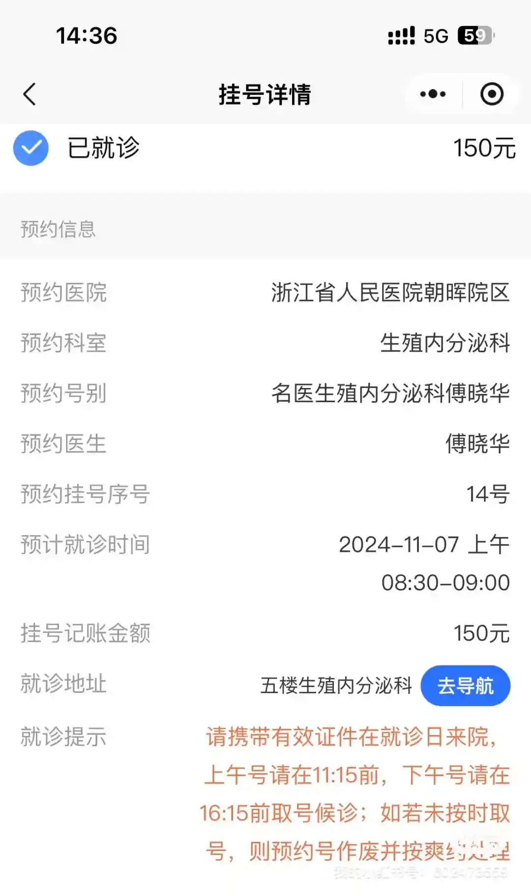 10月底我们计划将试管提到日程,11月7号(姨妈前3天)我们就去了浙江省人民医院挂了傅晓华医生的号(朋友推荐),名医号150元一次。当天医生看完我过往的病历单之后就建议我们直接试管,我们也同意了。