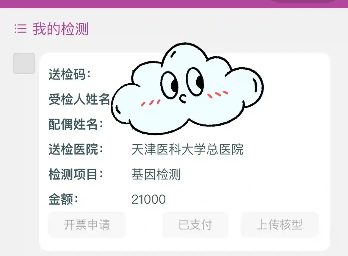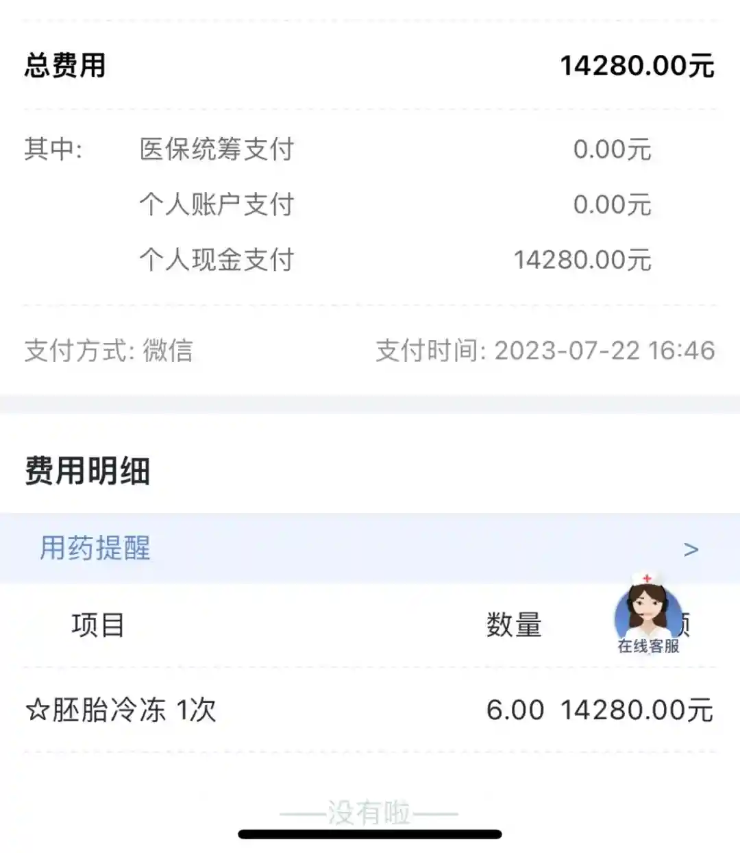 然后就是缴费 冷冻费一个是2380,检测费一个是3500,总体下来也就是一个5880,我一共是6个,交了35280。