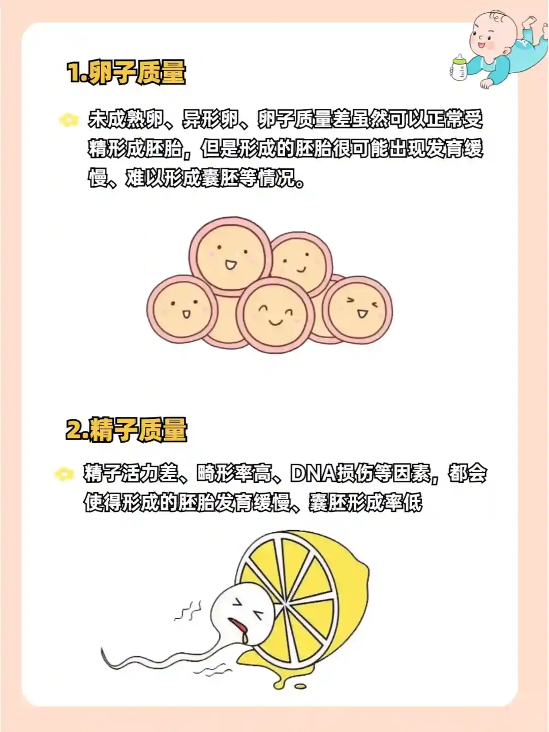 未成熟卵、异形卵、卵子质量差虽然可以正常受精形成胚胎,但是形成的胚胎很可能出现发育缓慢、难以形成囊胚等情况。