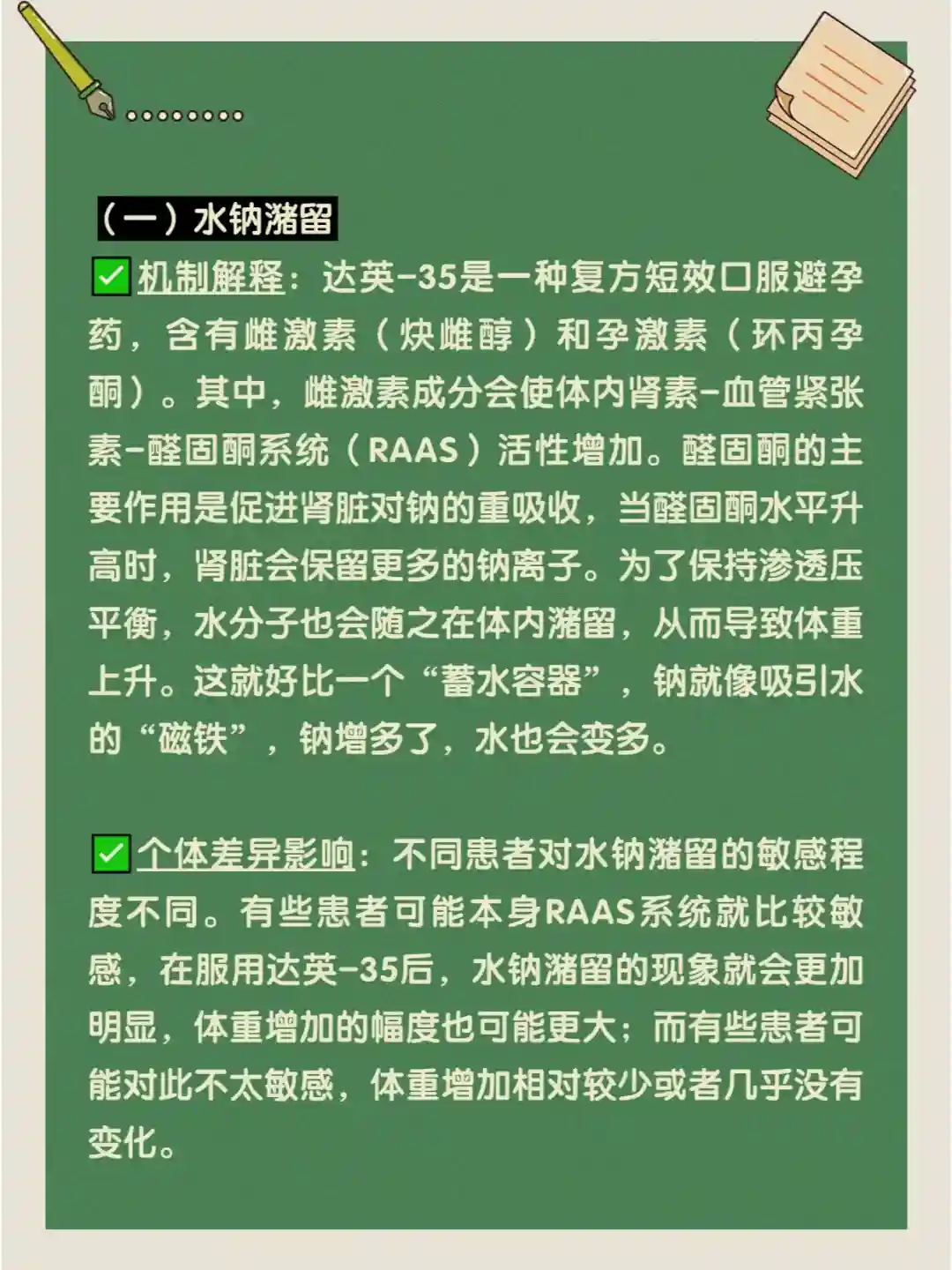 ✅机制解释:达英-35是一种复方短效口服避孕药,含有雌激素(炔雌醇)和孕激素(环丙孕酮)。其中,雌激素成分会使体内肾素-血管紧张素-醛固酮系统(RAAS)活性增加。醛固酮的主要作用是促进肾脏对钠的重吸收,当醛固酮水平升高时,肾脏会保留更多的钠离子。为了保持渗透压平衡,水分子也会随之在体内潴留,从而导致体重上升。这就好比一个“蓄水容器”,钠就像吸引水的“磁铁”,钠增多了,水也会变多。