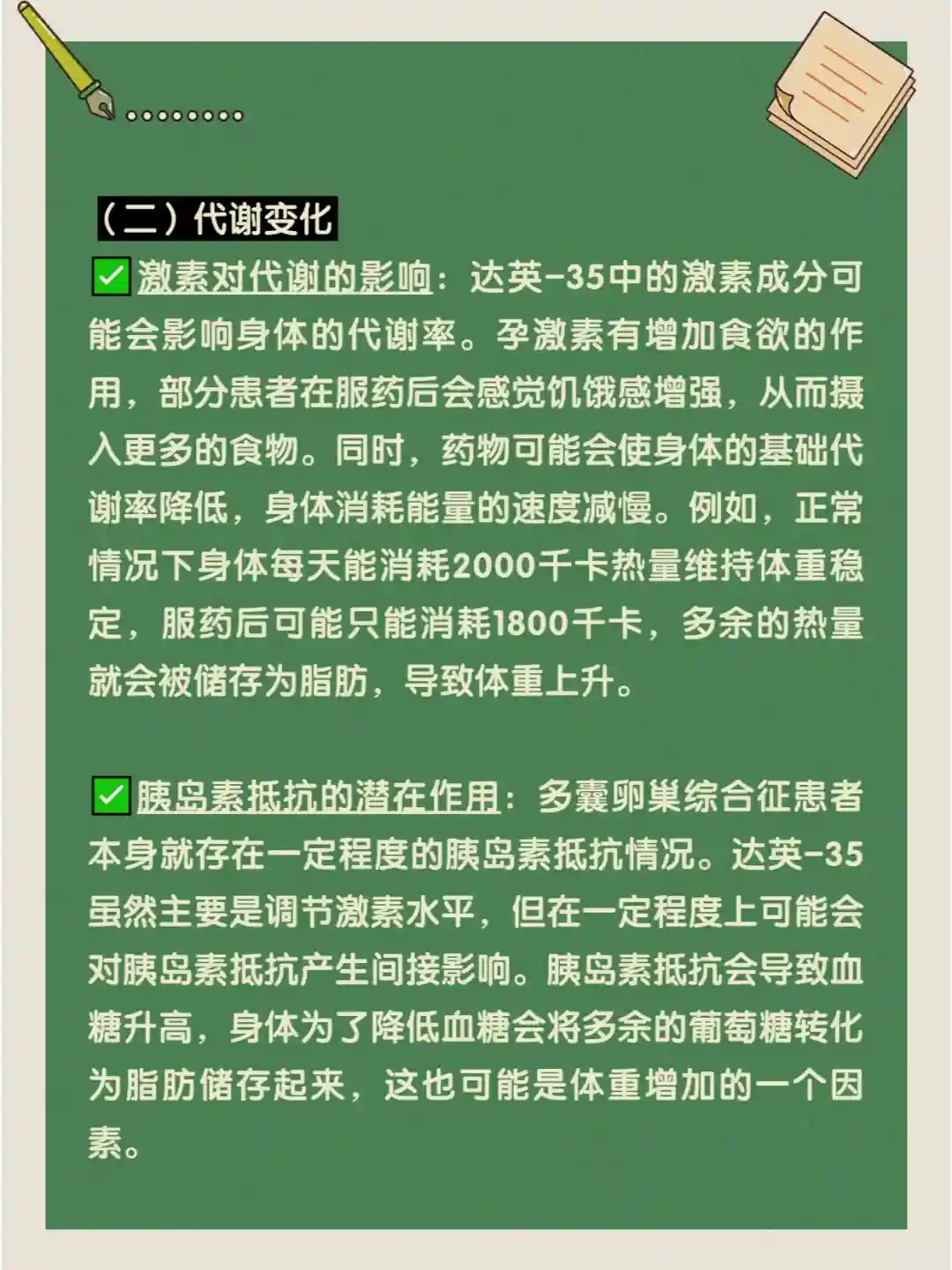 ✅胰岛素抵抗的潜在作用:多囊卵巢综合征患者本身就存在一定程度的胰岛素抵抗情况。达英-35虽然主要是调节激素水平,但在一定程度上可能会对胰岛素抵抗产生间接影响。胰岛素抵抗会导致血糖升高,身体为了降低血糖会将多余的葡萄糖转化为脂肪储存起来,这也可能是体重增加的一个因素。