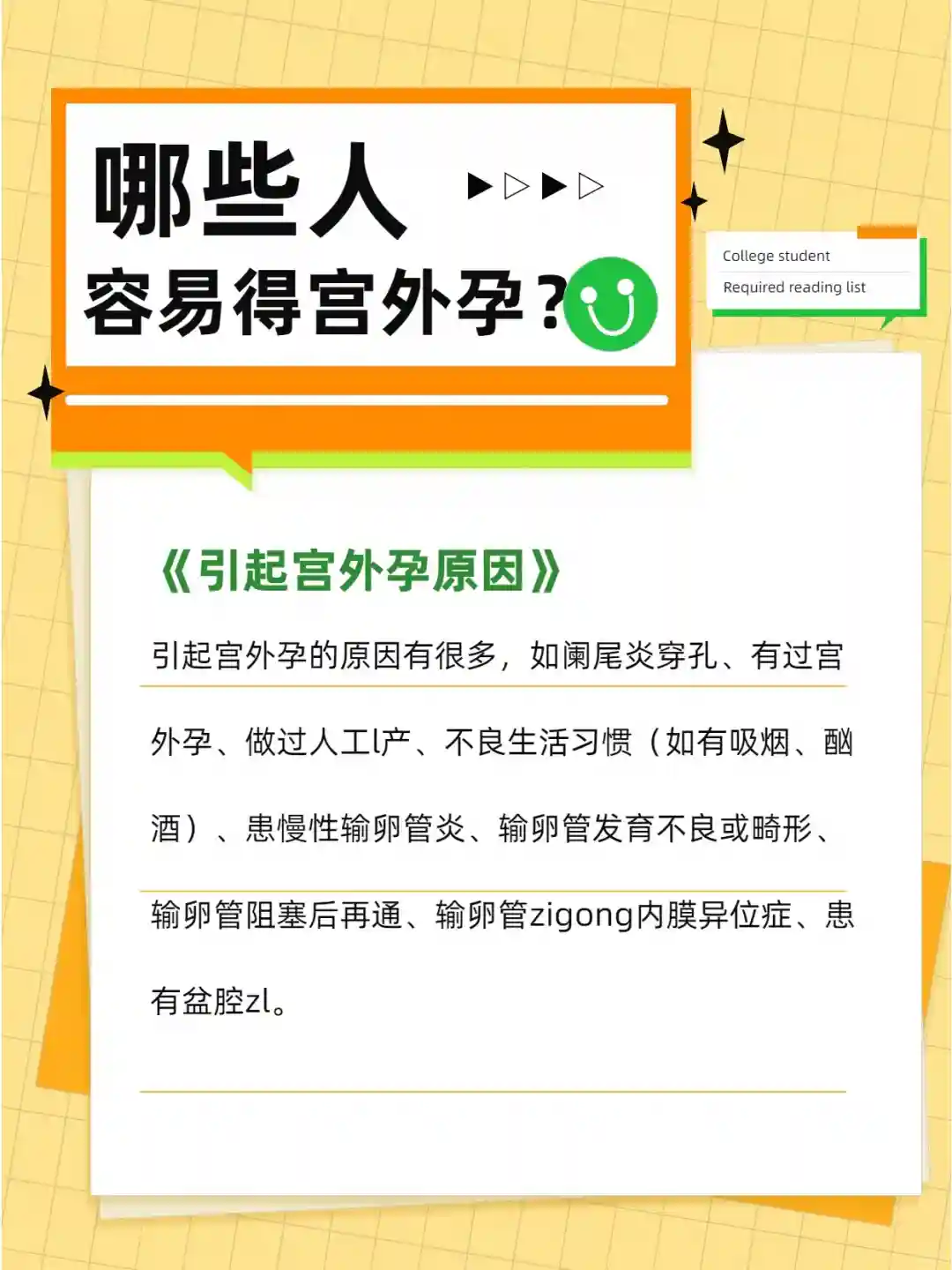 引起宫外孕的原因有很多,如阑尾炎穿孔、有过宫外孕、做过人工流产、不良生活习惯(如有吸烟、酗酒)、患慢性输卵管炎、输卵管发育不良或畸形、输卵管阻塞后再通、输卵管zigong内膜异位症、患有盆腔zl。