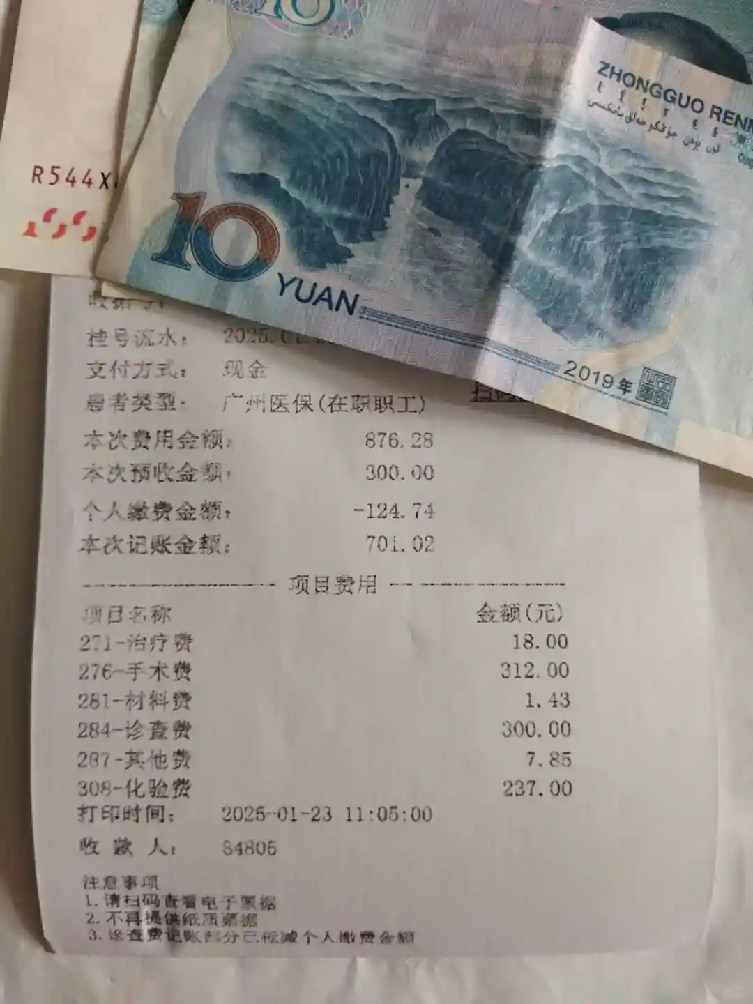 摘完后教授给开单送病理检查,医保统筹下来倒是给我返回一百二十多块。