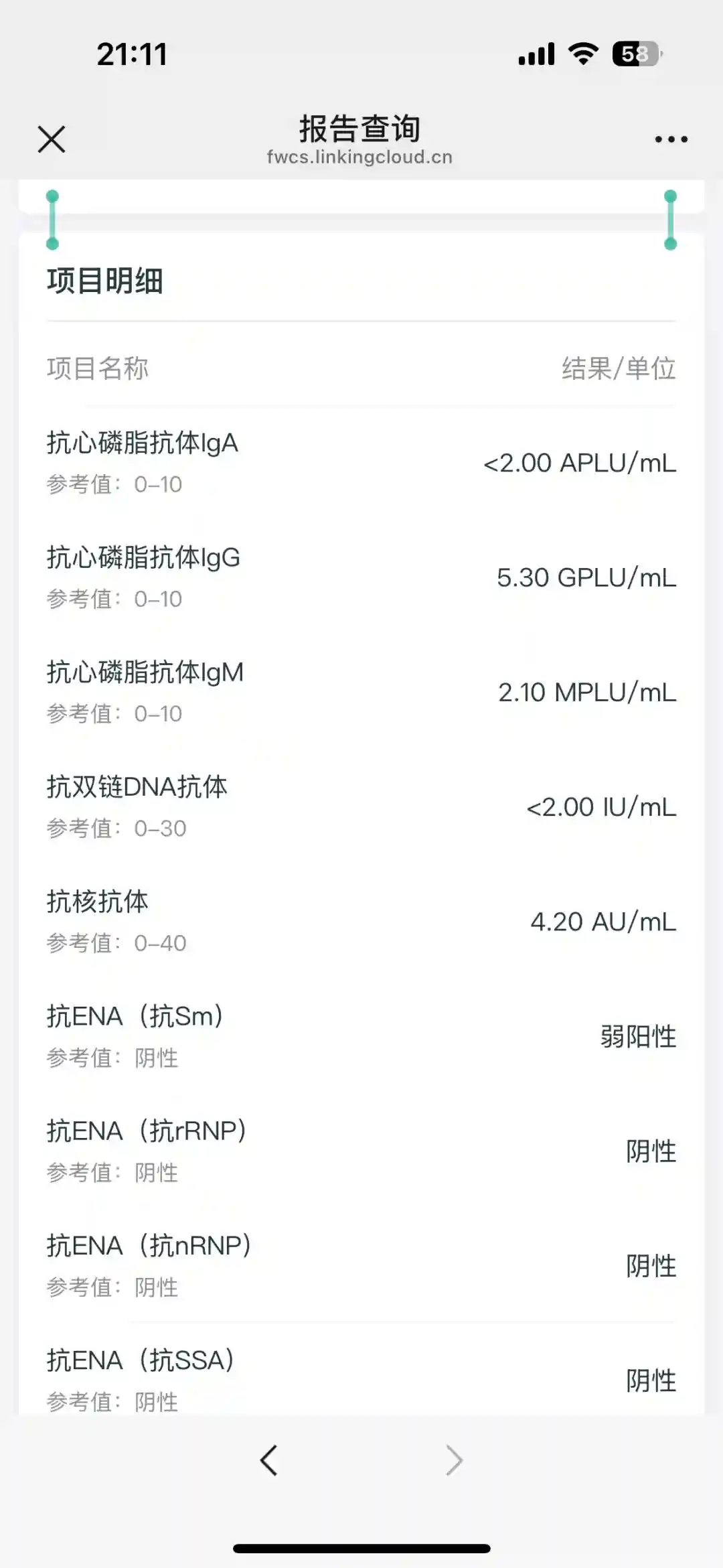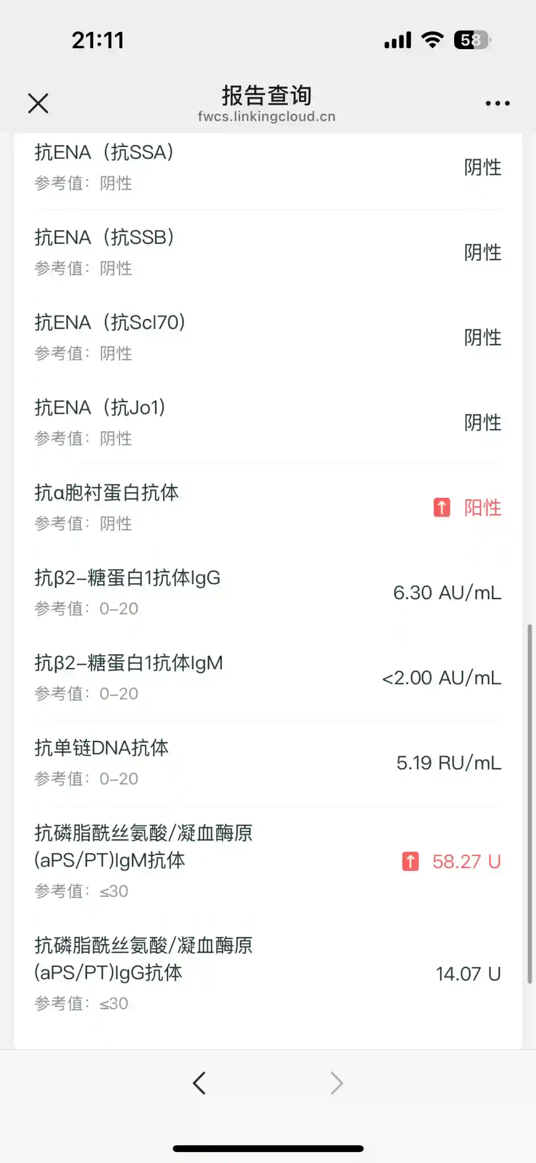 手术后取组织做了胚胎染色体🧬确定是染色体三体,属于偶发事件,双方做了染色体检查,我还做了基础免疫,狼疮抗凝物和胰岛素抵抗糖耐测试,狼疮抗凝物阴性,双方染色体结果还没出。我一直以为多囊肯定也会有胰岛素抵抗,还各种对症状,胰岛素结果没有问题,不过一直以来我也在刻意控糖🍬,多吃蛋白质和蔬菜少碳水,少吃或不吃油炸食品和小蛋糕🧁等。虽然胰岛素没有问题算是小小的一个慰藉。但是抗α胞衬抗体阳性,抗磷脂酰丝氨酸/凝血酶原lgM数值很高,不知道这个会对后续备孕有什么影响,有没有懂的姐妹👭?约了月底生殖免疫专家顾磊的号,到时候具体咨询下。