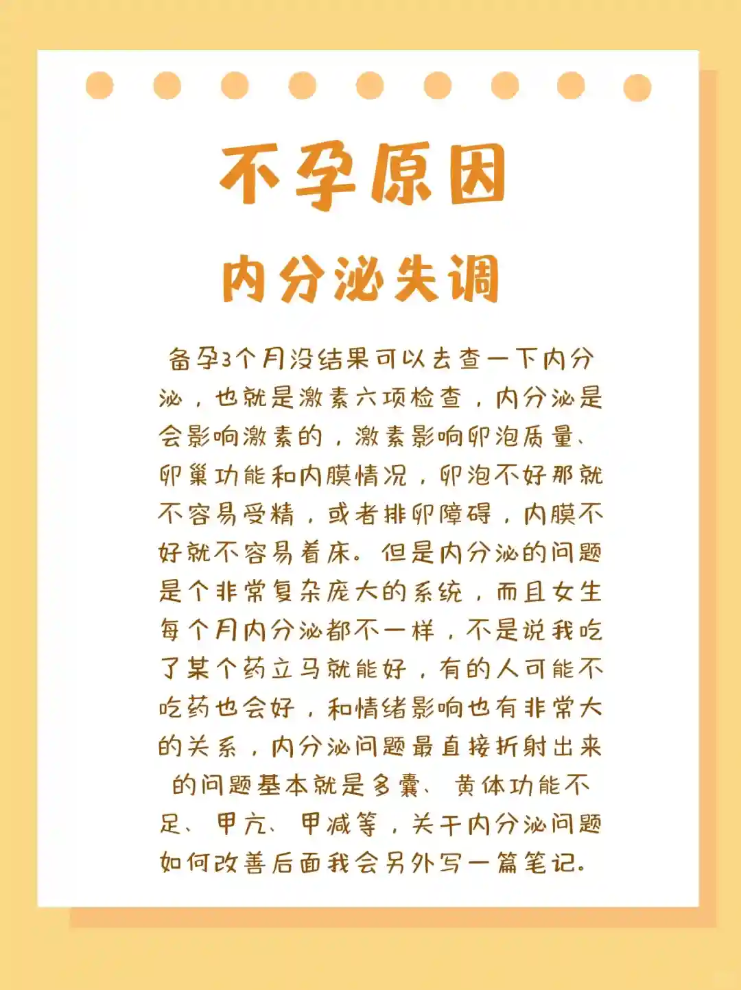 备孕3个月没结果可以去查一下内分泌,也就是激素六项检查,内分泌是会影响激素的,激素影响卵泡质量、卵巢功能和内膜情况,卵泡不好那就不容易受精,或者排卵障碍,内膜不好就不容易着床。但是内分泌的问题是个非常复杂庞大的系统,而且女生每个月内分泌都不一样,不是说我吃了某个药立马就能好,有的人可能不吃药也会好,和情绪影响也有非常大的关系,内分泌问题最直接折射出来的问题基本就是多囊、黄体功能不足、甲亢、甲减等,关于内分泌问题如何改善后面我会另外写一篇笔记。