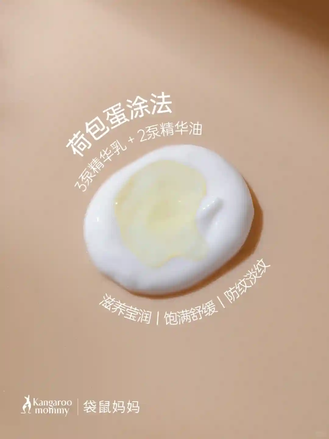 1、挤3-4泵精华乳+1-2泵精华油不仅能淡纹紧致而且能保持肚皮水润