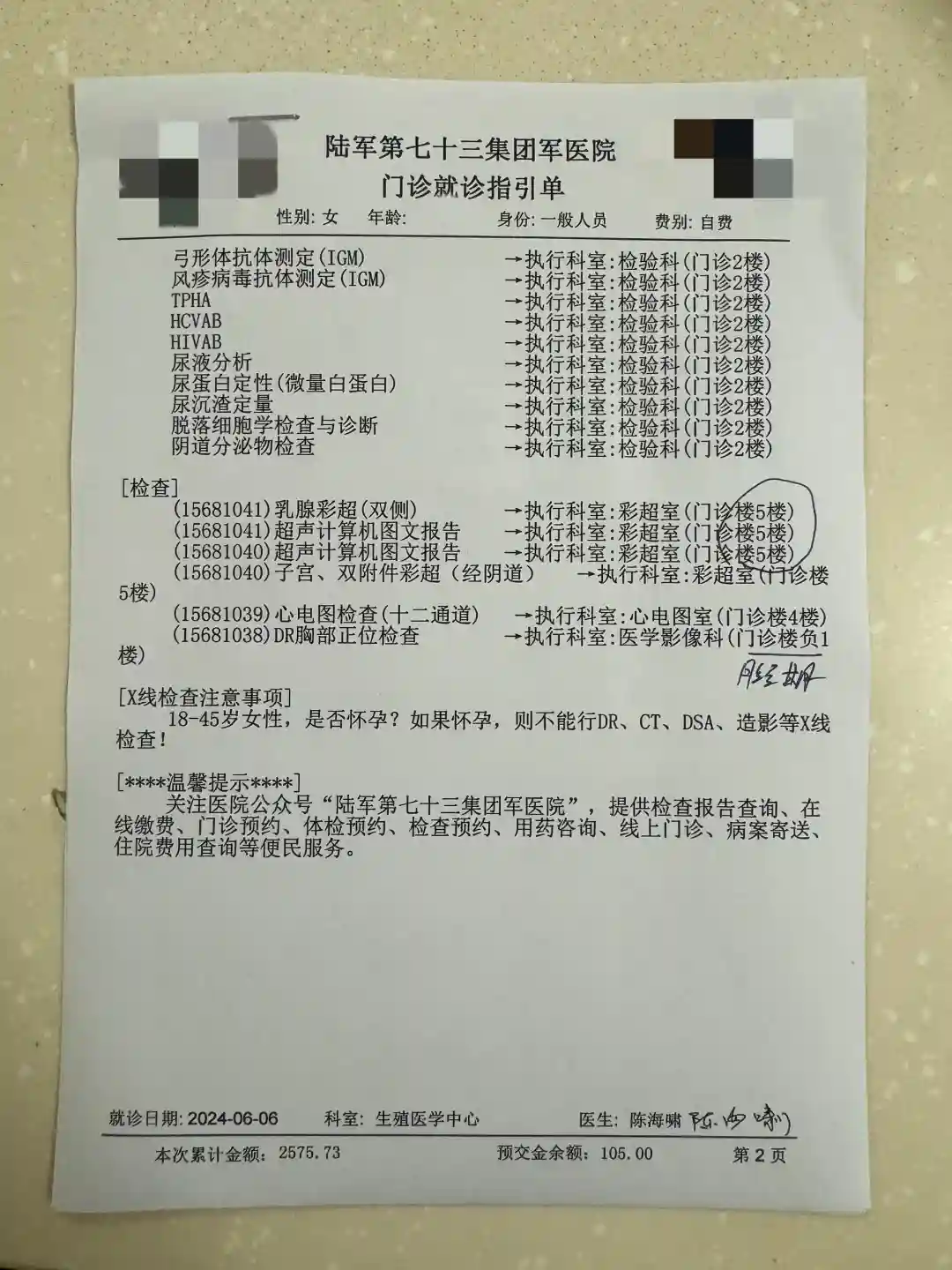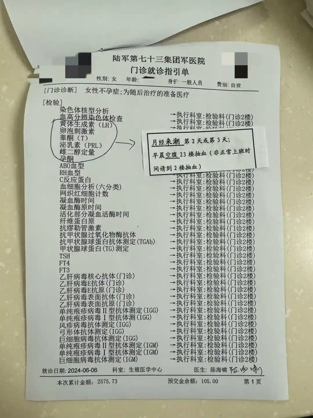 24.6.6今天踏出试管的第一步,挂了生殖三组陈海啸的号,约了早上9:35分,有等了一会,问了一些基本情况,顺便看了一些我之前检查过的报告,问我是想自然怀呢还是试管,如果能自然怀那是最好啦,先去检查了阴道B超,检查完回来我属于多囊的症状,左右侧有十个卵泡,右侧有个卵泡有大正要排,但是之前造影右侧输卵管有堵,就没啥怀孕的机率,只能说等下次在检查造影看看,我说干脆直接试管啦,本来也奔着试管来了,就是因为很多年没怀上。那医生就直接给我开了非经期一些检查的项目,抽血跟B超,抽了七八管血,有点低血糖加上空腹直接晕倒了,整个人直接不行了,体贴的护士长赶紧拿了糖跟水给我补充体力,让我别紧张,我慢慢的缓解过来了,接下去就是等待报告,有个报告要到下午四点才能拿,拿到报告给医生看了一下,一切都正常,剩下染色体报告要14天后才能有,完成可以回家啦。等姨妈第二天再来抽血啦~希望一路绿灯