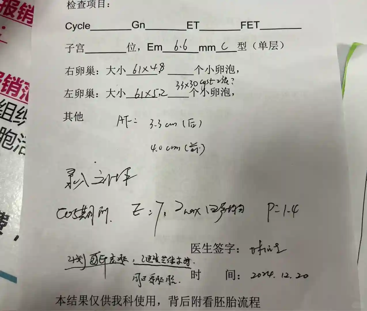 12月20日是我取卵的第三天也是看胚胎的日子,昨天由于工作忙所以今天来记录,6.30起床收拾7.30到达二院地下停车场,跟队友上来先去取了b超号还好不算等很久是第17个(b超号是之前大白都开好了的直接约的看胚胎当天8.00到9.00所以不用再自己约),进去打b超医生说还是有些腹水后部要稍微好一点,打完b超出来想去找组上大白看一下胚胎等级情况,结果大白说还没出来让我先去谈话间,说一般谈话间的结果出来了组上医生这边才看得到,就跟队友去了谈话间排队,在外面等的时候真的是巨紧张磨皮擦痒的而且可以看到有些看完胚胎出来下午要进行移植鲜胚的姐妹无比羡慕哈哈哈。叫号到我了进去,医生说取卵11个,成胚7个(优胚3个普胚4个),离我预想的还是差了心里挺失落的,额头汗水也跟着冒,谈话间医生说有可能移植鲜胚哦 但是看了一下我的腹水和打夜针当天的孕酮又不太确定让我去问一下组上老师再回来找他,我和队友赶快去找了刘坪大白,大白看了下我的腹水和孕酮也不太确定,让我跟她一起去找松松问一下,到了松松诊室刘医生给他说了一下我的情况,然后松松问我的孕酮是只有一天高吗,刘医生说对 只有那一天,然后松松想了一下说让我移植两个鲜胚,心里正高兴呢结果高兴太早松松和刘大白又在讨论可以养囊什么的,有种不好的预感!!结果刚走到门口跟刘大白对视了一下就让我回去给我改一下,让我冻2养5第五天也就是周末再来看胚胎,脑袋懵懵的也不知道怎么走出的诊室就觉得很懵然后去了谈话间,谈话间大白看了组上医生写的纸条确认了方案,就让签字画押,开了b超让周末返院打b超跟看胚胎流程一样。出来后觉得还是没搞懂为什么突然变了跟队友说不行还是要再去问一下,又去问了组上大白,大白意思说我孕酮有一天有点高加上还有腹水所以不太保险,移植了腹水会更严重所以改用养囊,好叭医生怎么说就怎么做吧。然后就下一楼缴费,取卵后开的药继续用起走,11点钟出医院今日份任务完成✅