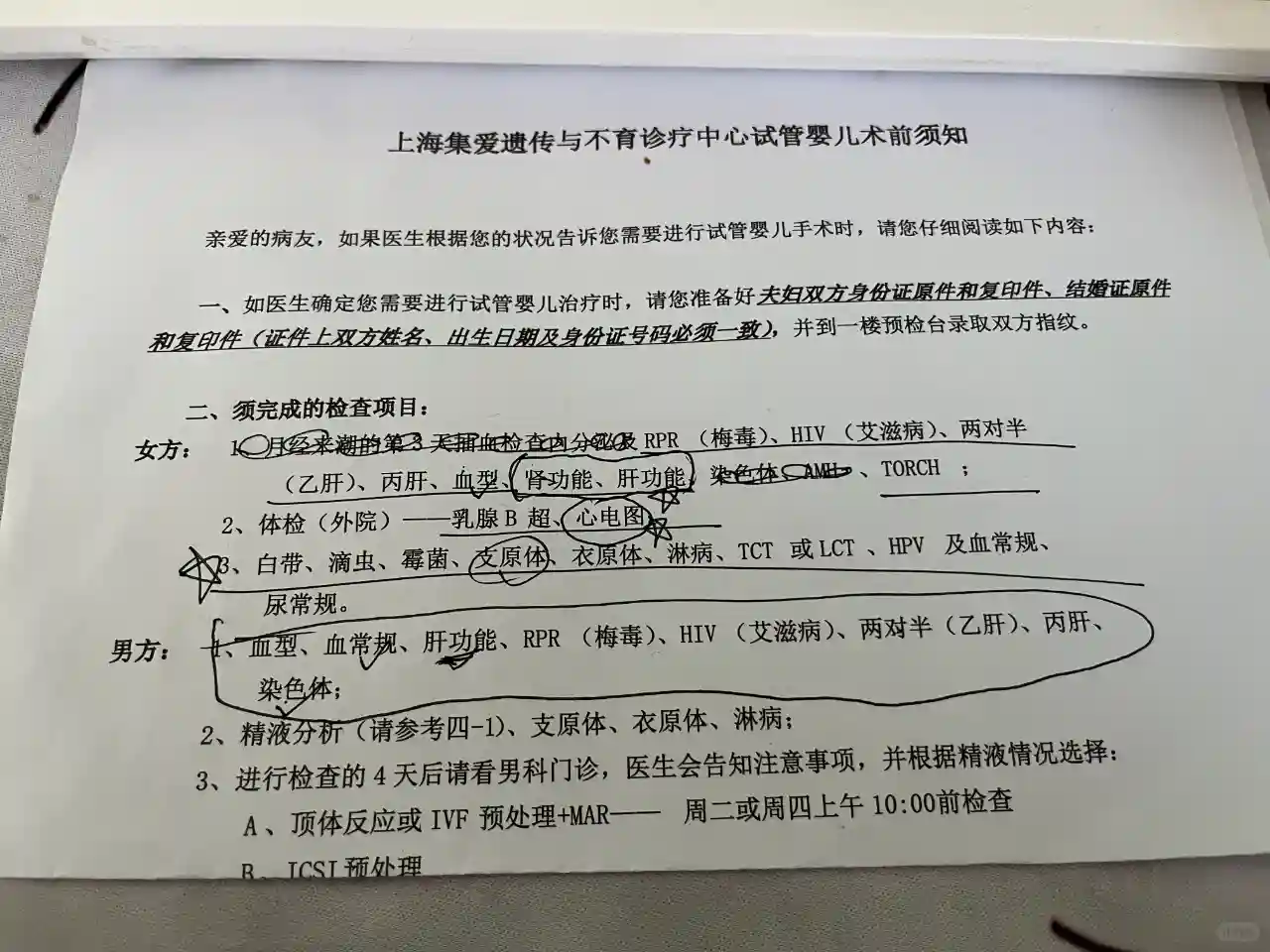 因为是姨妈第三天当时去做了个阴超,看了看基础卵泡,李医生告诉我做一代就可以。试管前的检查李医生会让我们回本地做,拿出检查单告诉我们检查哪些,说检查完等下次姨妈来2-3天就可以带好双方身份证和结婚证去找她啦~(检查项目是图片中画横线的,姐妹们可以提前做好再去找医生哟,一年内有效。但男方精液需要在本院查~)男科医生比较简单粗暴,直接开了检查,我们2个月前才做的精液检查,但必须要在本院重新做~