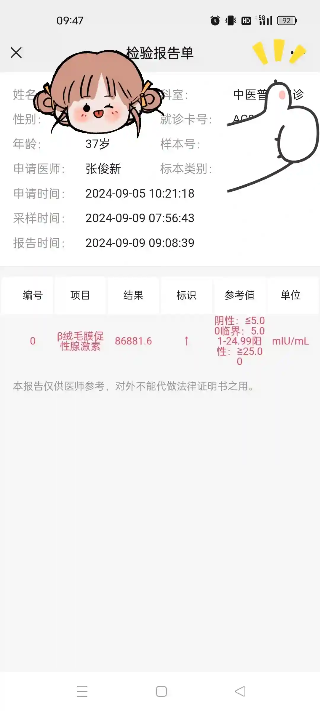 8月初正式进入移植周:针灸由原来3次改为工作日每天去。8.14号移植日,移完仍坚持去针灸助着床。来张医生这让我安心、每天他都会把脉问我情况。8天后成功开奖,针灸继续…一路绿灯翻倍都很顺利!9月9号HCG8万多,哈哈二超已做,胎心胎芽已出谢谢宝宝争气与努力