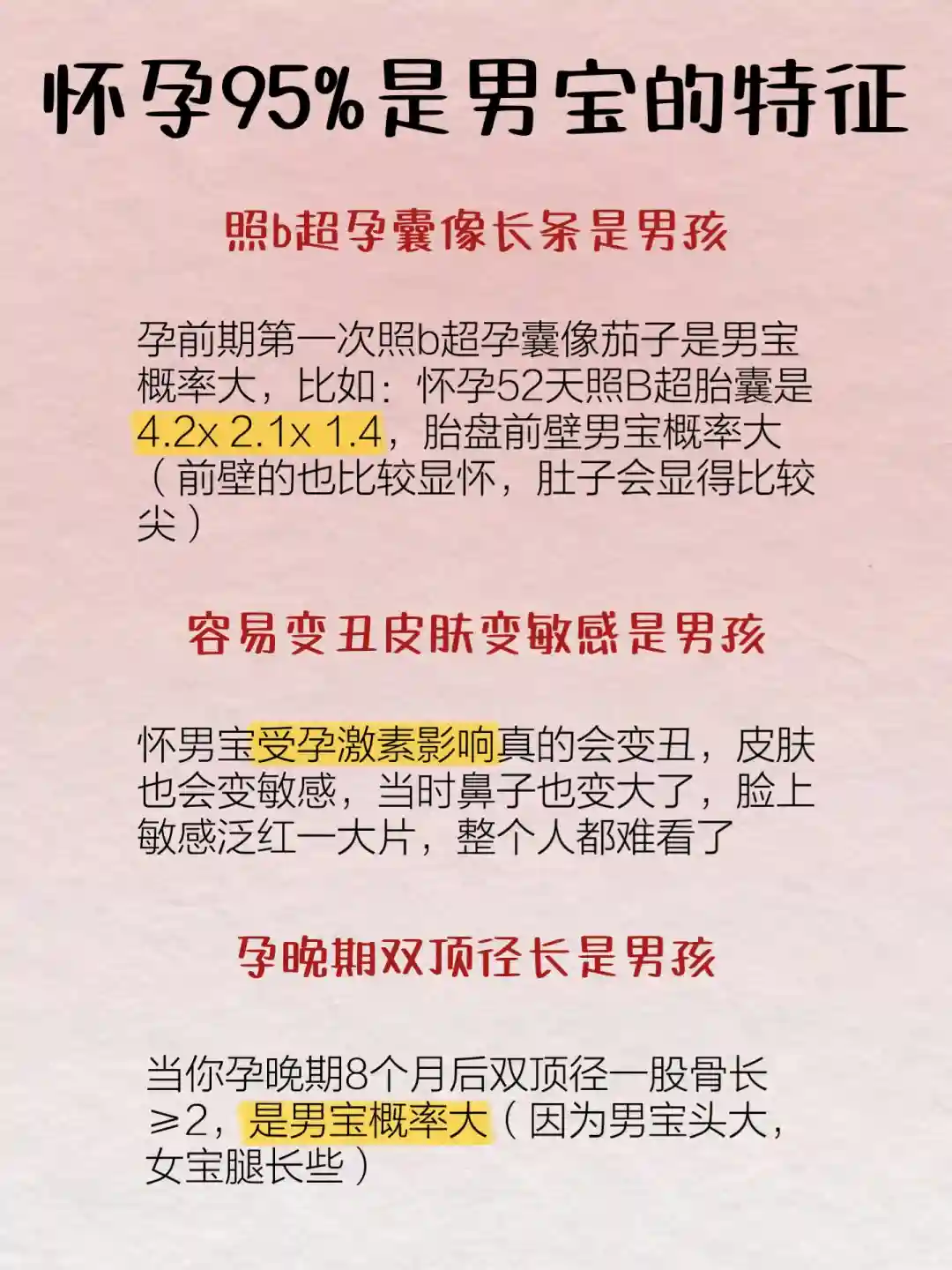 1.B超孕囊像长条是男孩2.孕晚期双顶径长是男孩