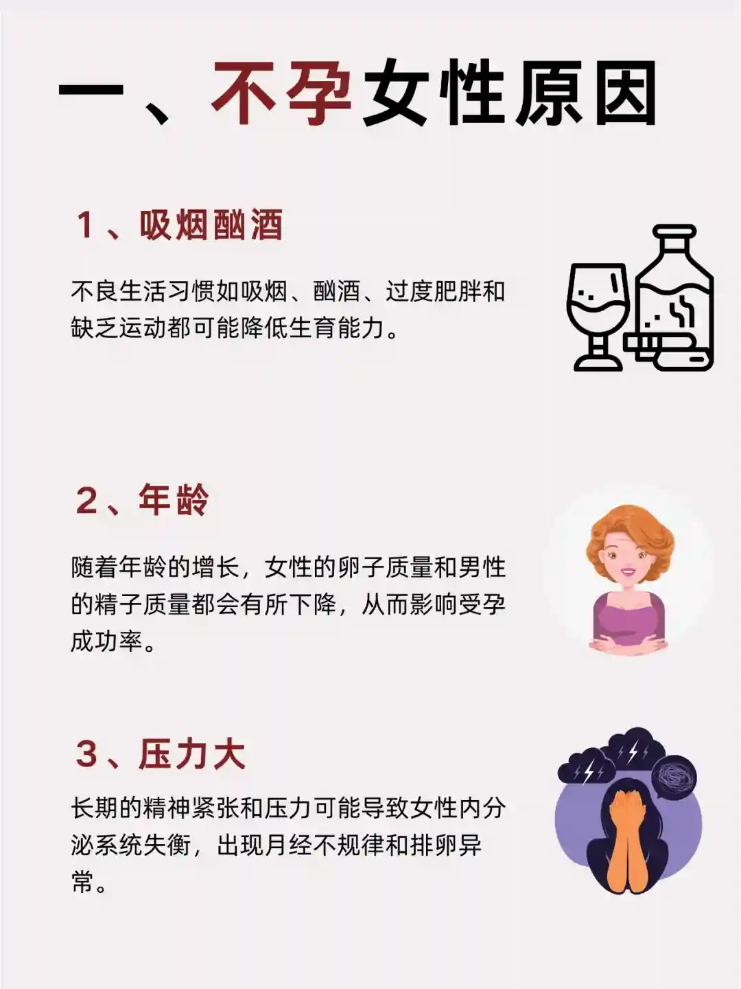 1、吸烟酗酒:不良生活如吸烟、酗酒、过度肥胖和缺乏运动都可能降低生育能力