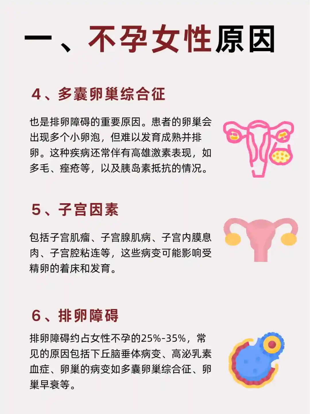 6、排卵障碍:排卵障碍约占女性不孕的25%-35%,常见的原因包括下丘脑垂体病变、高泌乳素血症、卵巢的病变如多囊卵巢综合征、卵巢早衰等