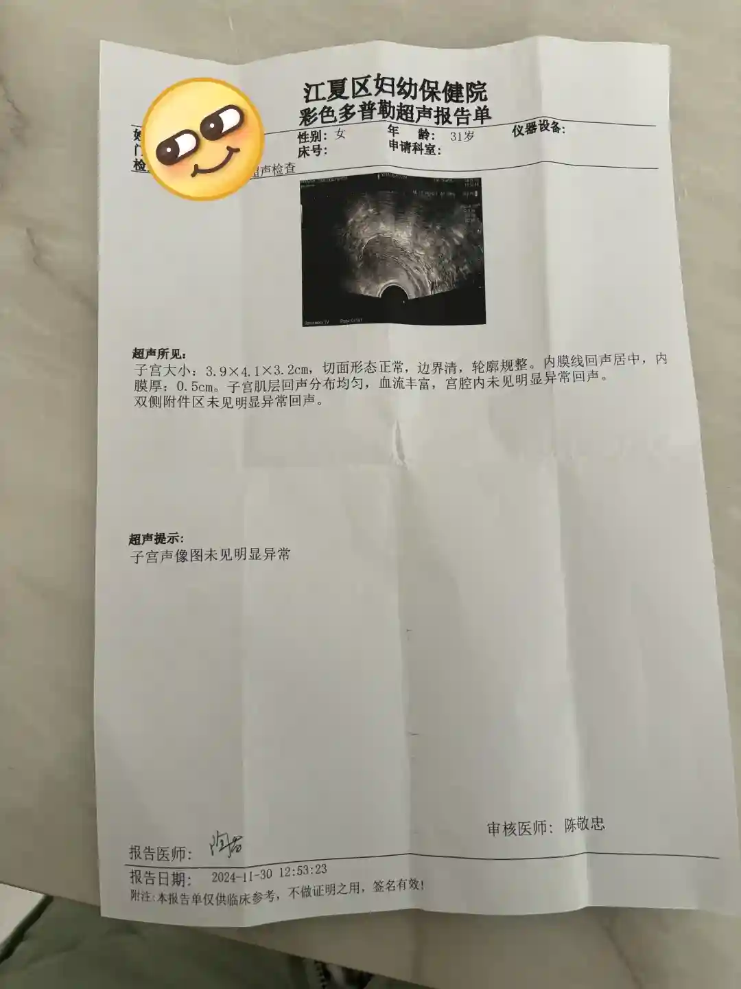 妇幼的抽血结果大概4天拿到了,基因检测的结果大概7天拿到。做检查的时候会让加群和加一个医生微信,有疑问可以群里或者私信问他们。然后拿着单子去了妇幼保健院(那里中午有值班的),B超可以选择阴超还是B超,我开始选的B超,喝了好多水憋了40分钟才憋好,但是子宫后位只能做阴超,又做了阴超,时间挺快,从进去到喝水憋尿后面拿到检查报告出来,停车场时间显示待了55分钟。