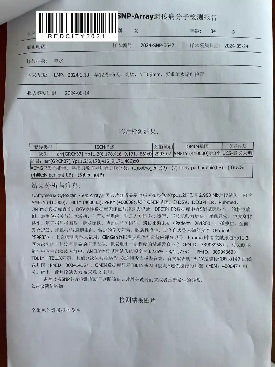 报告下方的解读可以清晰看到结论,基因分析显示该病例在染色体Yp11.2区域发生2.993Mb片段缺失。这段缺失到底会产生多大的影响呢,只能在庞大基因库中比对是否有相似案例,结果分析的中间一整段都是与各基因库的比对结果,以我的报告为例,在DECIPHER数据库中有5例相似病例,表现为发育迟缓等,反正都是特严重的病。但是,这些临床案例可以说是孤例。因为没有明确的致病性证据,最终结论就是临床意义不明。#羊水穿刺