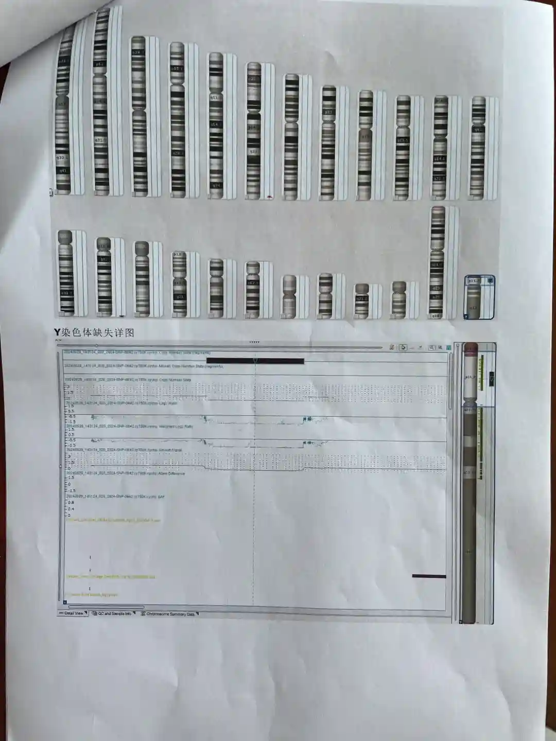 2.ISCN描述:这串长数据是变异发生的位置,以我的报告为例,ARR是检测类型,Yp11.2意思是缺失发生在Y染色体上P11.2区域。正常人有23对染色体,其中1-22号是常染色体,第23对染色体是性染色体。男性的性染色体是XY,女性是XX。我这段缺失恰好发生在Y染色体上,所以虽然医生解读不会告诉性别,我也间接知道了胎儿性别。p指染色体的短臂,q指长臂,p11.2意思是在Y染色体短臂11.2区位。图二可以看到这段Y染色体的缺失详图。