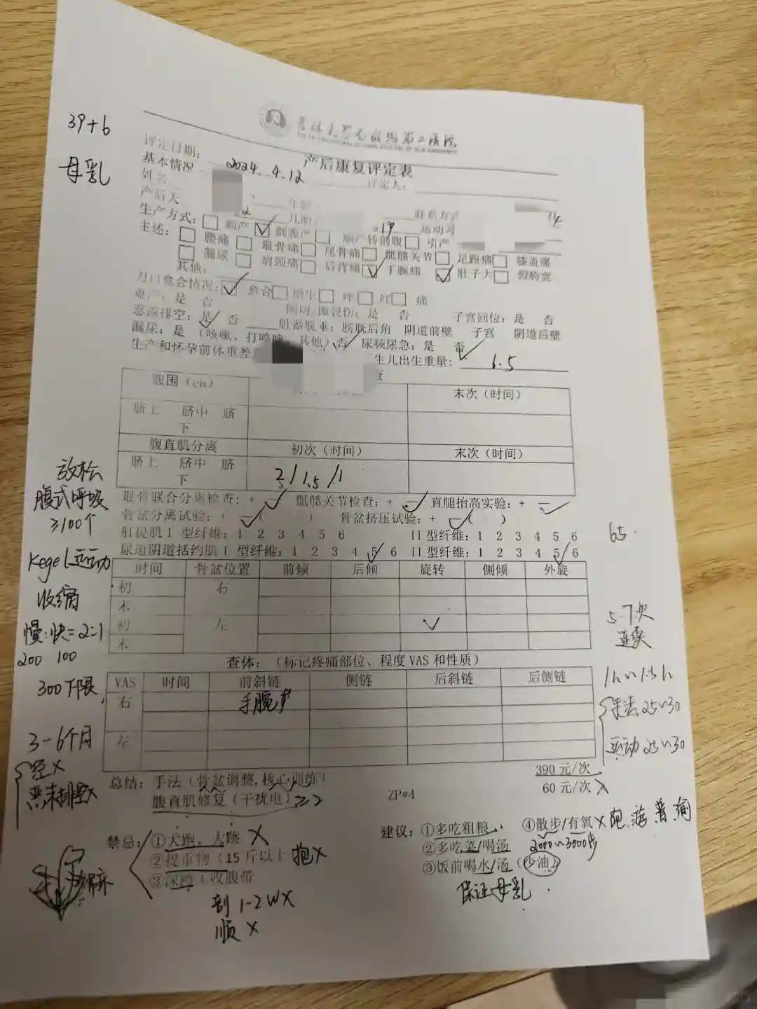 评估完会有图4这样的一张纸,不能带走,可以拍照,老师也会根据评估情况有相应的手法,去做产康的时候交钱,390/次,连续做5-7次。腹直肌分离≥2指的可以做干扰电,60/次。