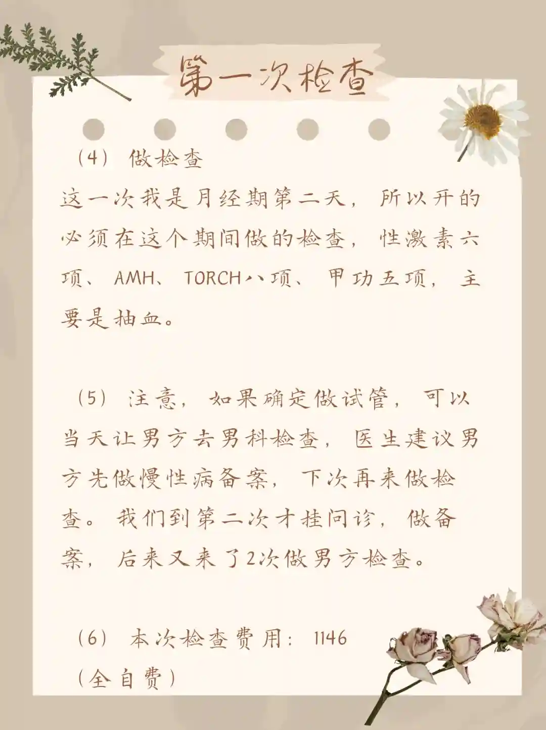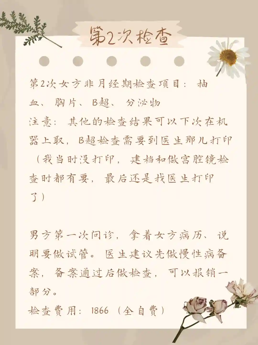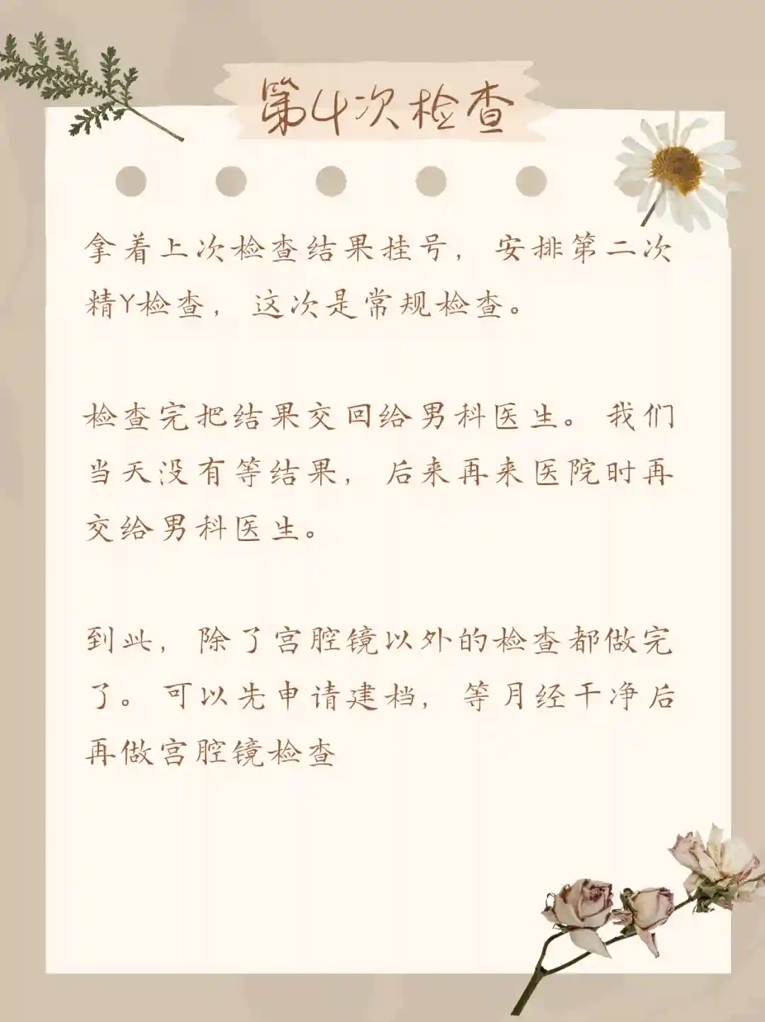 (5)注意,如果确定做试管,可以当天让男方去男科检查,医生建议男方先做慢性病备案,下次再来做检查。我们到第二次才挂问诊,做备案,后来又来了2次做男方检查。