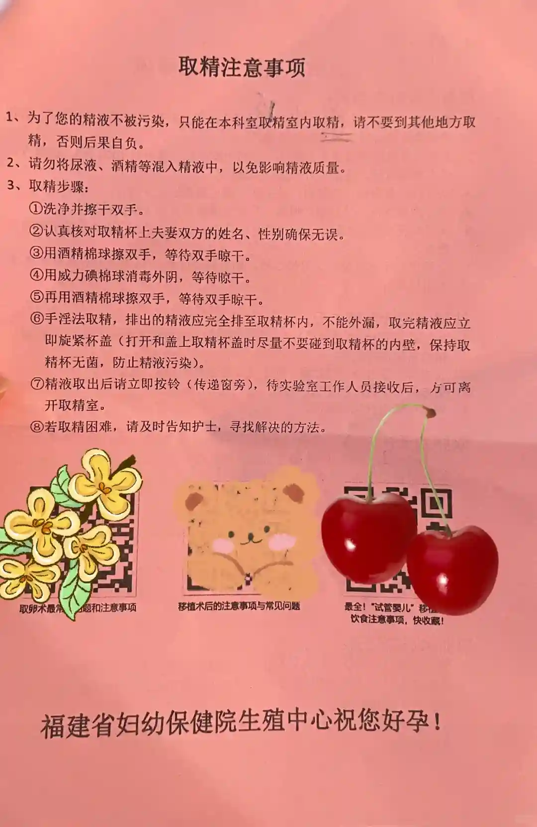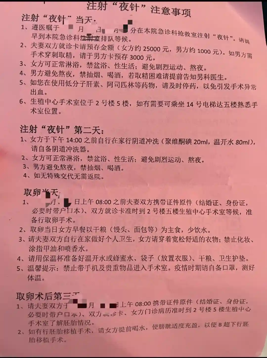 D14天第7次返院。早上起来夫妻双方先洗个澡做好清洁,要吃早饭,干粮少喝水(注意事项如图),到院先去排空尿液,然后手术室外面导台核对证件,指纹、人脸拍照,做好核对就带手环换鞋进去,水可以带进去,先放休息区床头柜上。队友听护士指挥去取精啥的,进去后先去换衣服,上半身可以穿,下半身全脱包括内裤袜子什么都不穿,柜子里取手术服穿,头发扎起来塞进一次性帽子里。换好衣服更衣室旁边等叫名字进去做冲洗,进去前记得衣柜里拿一片垫巾带进去。护士会给你消毒然后肛门塞一颗止疼药(大概持续6小时,会肠道直接吸收了),然后就是鸭嘴钳撑开进行消毒及温水冲洗(放轻松,不会很难受),清洗好后旁边有手术裤拿起来穿好去手术室门口排排坐,坐着等叫你,根据夜针时间决定第几个做。