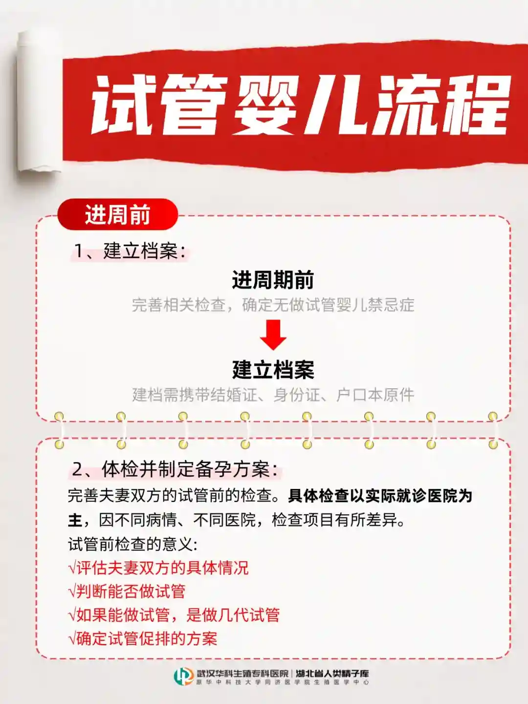 2、夫妻双方进周期前,完善相关检查,确定无做试管婴儿禁忌症,建立档案,建档需携带结婚证、身份证、户口本原件。