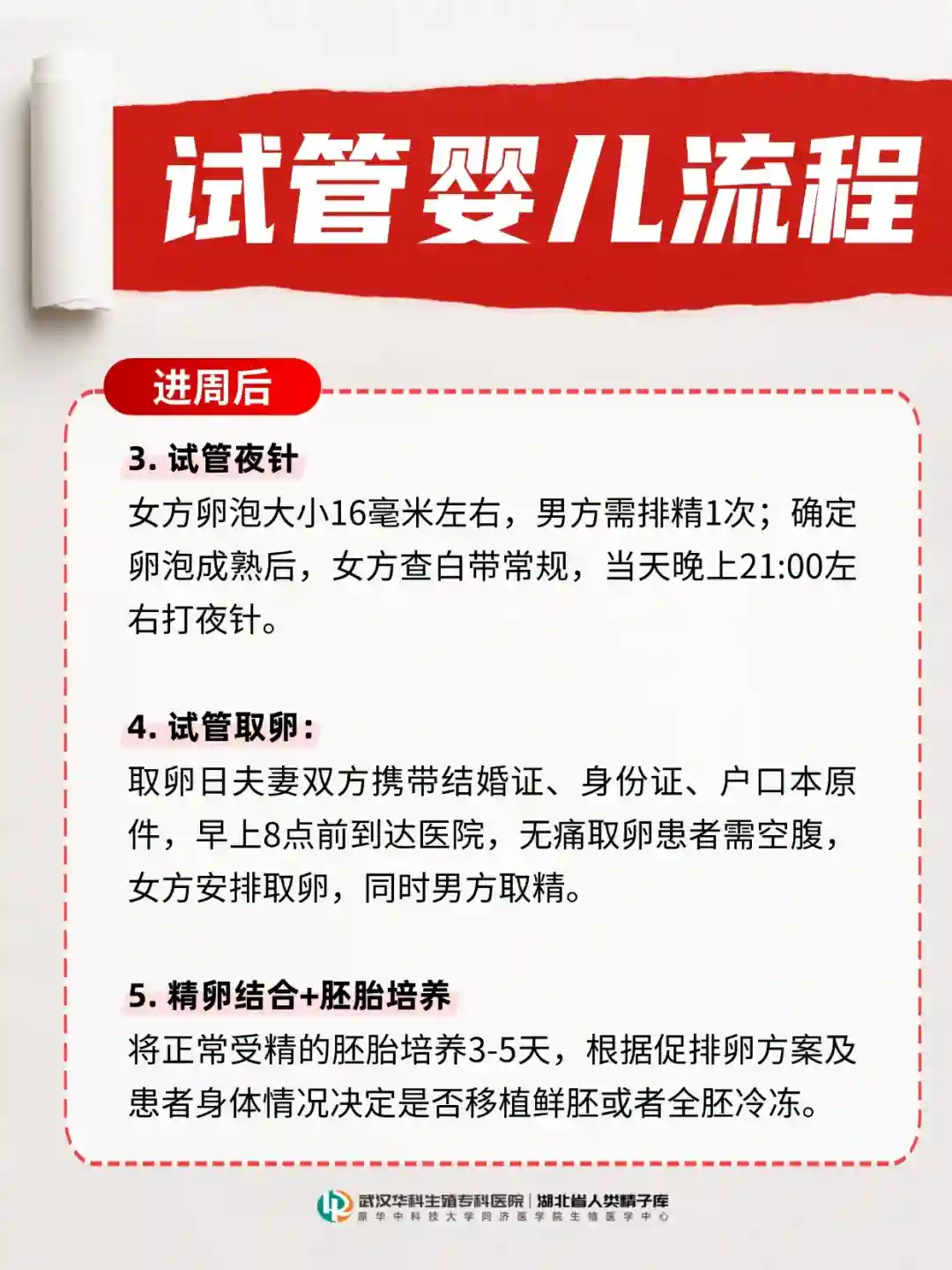 女方卵泡大小16毫米左右,男方需排精1次;确定卵泡成熟后,女方查白带常规,当天晚上21:00左右打夜针。