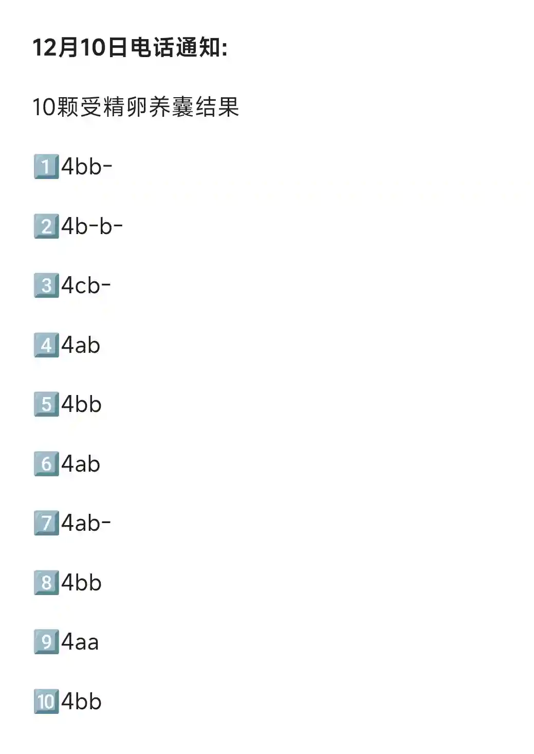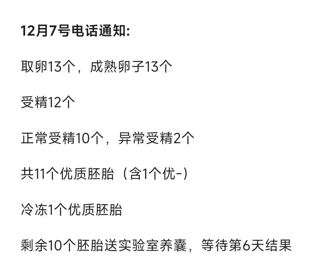 11.21建档,当天就开始为期12天的促排,全程谨遵医嘱做好药品冷藏、按时打针、定时吃药。原定12月3号晚上的夜针因为我个体的反应比较大所以提前到了2号,特别让我感动的是到了3号上午原定打防排针的时间郑医生在早上8点多突然给我打来了微信电话叮嘱我不用再打防排针了,还让我多喝电解质水!呜呜呜呜我是真的没想到自己居然还能接到主任亲自打的电话,她是真的有把病人放心上啊!!再后来就是4号取卵,然后忐忑的等待结果。我不敢报太大的希望,本来想着取13个,空泡几个,受精失败几个,再养囊失败几个,能有三五个能用的胚胎就谢天谢地了,结果我们爱情的结晶居然异乎寻常的成功13个卵子没有空泡,1个三天的优质胚胎冷冻后10个送去实验室的胚胎居然全部养囊成功!!不出意外的话我这辈子是不用再遭取卵的罪了