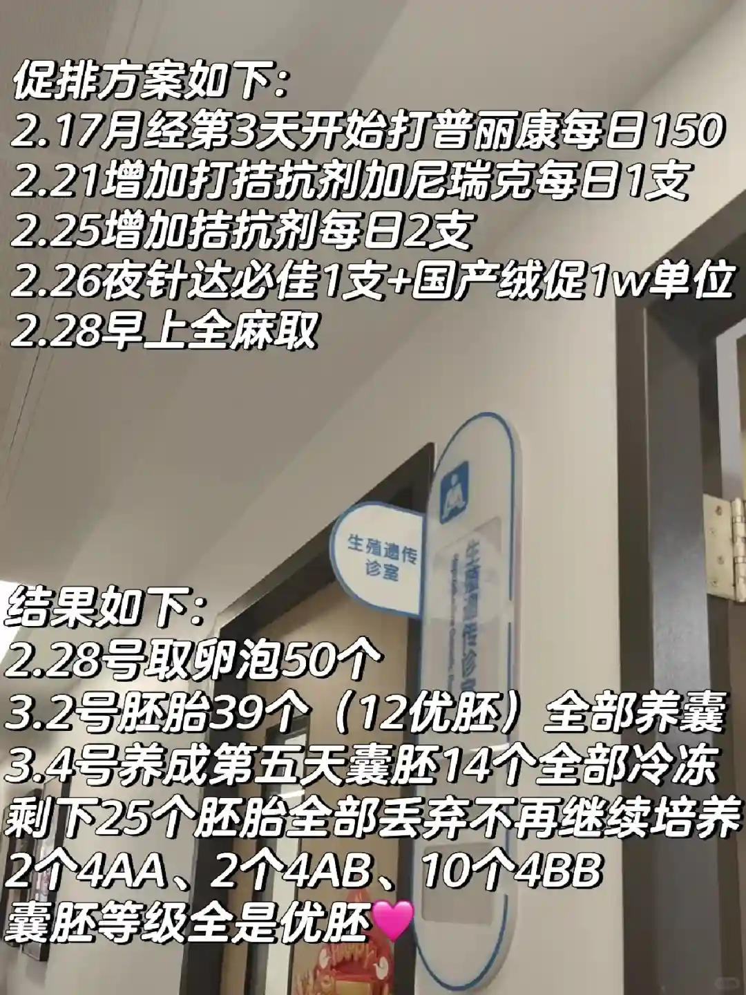 直到3.6号打电话查了14个囊胚的等级后才安心全是优胚,2个4AA,2个4AB,10个4BB1月初刚开始去到医院检查,2月过完年开始促排取卵,3月初就冷冻好了速战速决从第一次到医院输卵管检查到冷冻完全程花费2.1万我都有详细记录📝