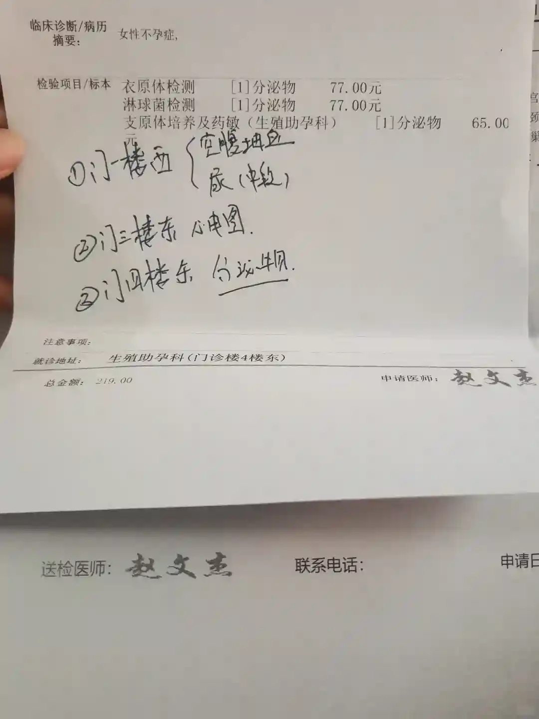 👉挂的王芳大夫的号,最后决定做人工授精,不行再试试管,大夫的一句话让我很感慨啊:怀孕要看缘分,缘分未到……emm………📑大夫看完去到导医台找护士小姐姐去开单子, 因为我早上吃饭了所以没法抽血,就只能改天再做,看了下单子上要做的检查项目,唉(╥ω╥`)其实之前备孕时候都做过,但是过期了,咱也没办法只好再做一遍,心疼口袋😭