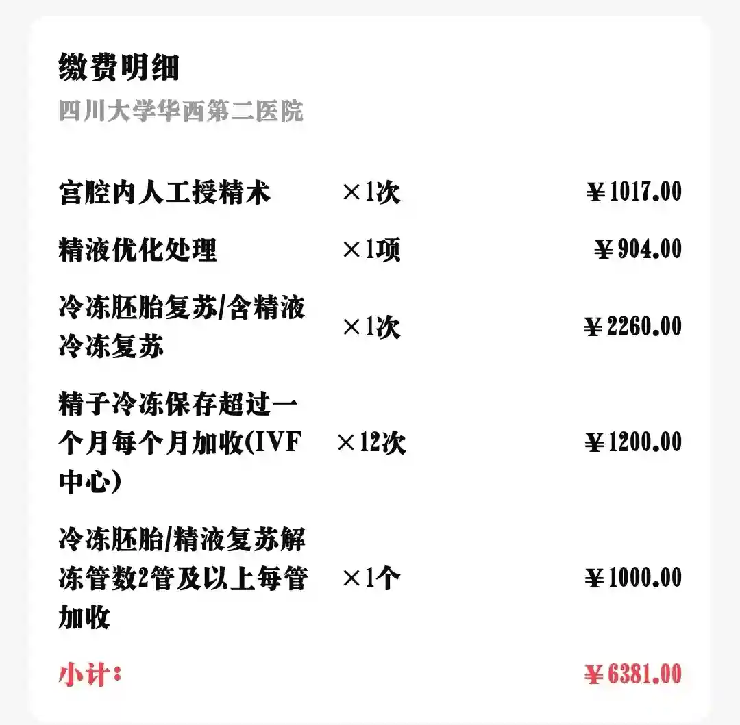 图一和图二是每次人授花费的大头,不包括每次打B超,吃药打针这些,我自身没有问题,每次小头差不多1000多(这一块可能姐妹存在差异,看医生对卵泡和内膜的监测用药情况),所以单次人授费用一共差不多1W多。如果不是供精,其实单次人授的费用3000-5000差不多。试管单次大概4W(医生说的,具体我也去查询)。人授对女生比较好,不遭罪,过程简单。有补充试管的姐妹评论一下下。
