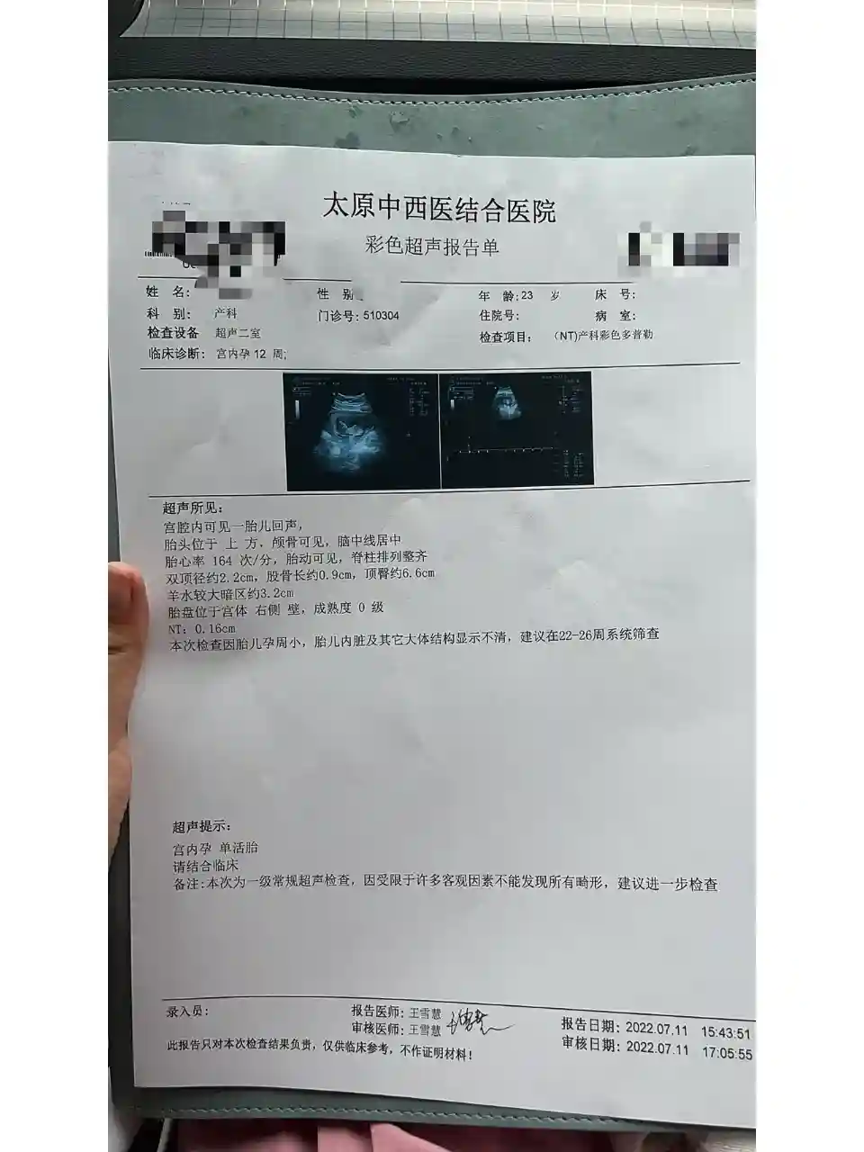 冒雨连忙赶去省妇幼,人太多,排不上了,而且中午了,就回家再做商量,虽然已经开始怀疑这个结果了,但是为了保险还是各种找医院看哪家下午能直接做呢,然后我姐姐的医院不用排队去了就能做,而且我姐姐两个都在那里生的,很有耐心,我就去了中西结合医院,去了挂号开单子排队做NT ,然后孩子姿势还是不对,医生给我又晃肚子,又让我出去走,进去出来5次,医生说“虽然我也不想遇到这样不配合的宝宝,但是咱们还是耐心点,你和他(她)商量商量让他(她)转过来”最后一次医生都要下班了孩子还不行,我都快放弃了,医生又晃了两次肚子,孩子转过来了,结果出来NT 值0.16cm ,安安全全的,然后坐诊医生也到下班时间了,但是还记得我没让她看单子,在哪里一直等我,看完以后医生说虽然正常,但是早晨的那个结果咱们也不能不管,但是不用着急做无创DNA和羊穿,等的15周做唐筛,唐筛结果都低风险那就可以放心点,后面四维也好好查查。我听了这话真的感觉有些医生是医生,有些真的就对不起这个职业。