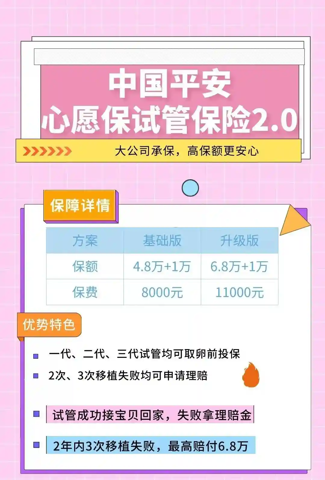 试管婴儿保险,不成功就赔付,试管成功了接宝宝回家!如果失败了,次数达到,也可以拿回支出,给钱包回回血,并不会亏损多少。✅中国平安心愿保试管保险