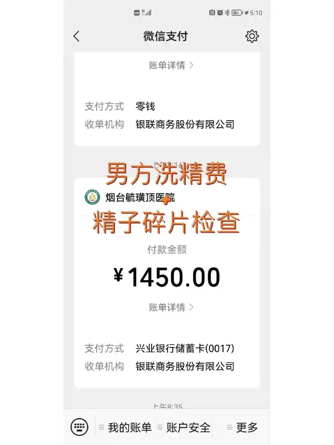 之前提过,衣先生精子碎片高,59%。医生让吃的复方氨基酸,七叶皂苷钠片,辅酶Q10。我们自己又加了五子衍宗丸。一共吃了4个周。后复查60%,用药完全没效果。结果出来后找了男科的陈杰医生。(陈杰医生真的非常非常好,很耐心,会认真解答问题,比男科其他的医生要好很多,如果各位姐妹的老公需要看男科,强烈推荐陈杰医生)第二次结果出来后,我和衣先生都觉得可能要做二代试管了,但是陈杰医生说,建议先洗精试试,如果实在不行,再考虑二代试管。于是我们今天又去了,480元的精子碎片检查费用,1000元洗精费。下午结果出来了。降到了4.9%。效果还是很明显的,我俩也终于放心了。明天我就开始进周了。继续起早去毓璜顶。