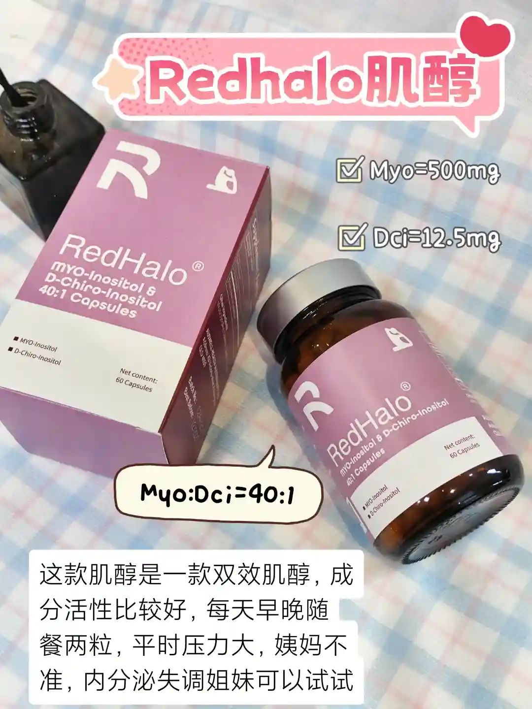 ✅补充肌醇,肌醇是人体必需的营养素,本质是一种类似维生素的物质,又被称为维生素B8。redhalo肌醇,是一款双效肌醇,同时含有myo和dci两种成分,肌醇比例40:1,成分活性比较好,含量也合适。一天两次一次两粒,每天早晚随餐服用。多囊、胰岛素抵抗、备孕、姨妈不规律的女生。