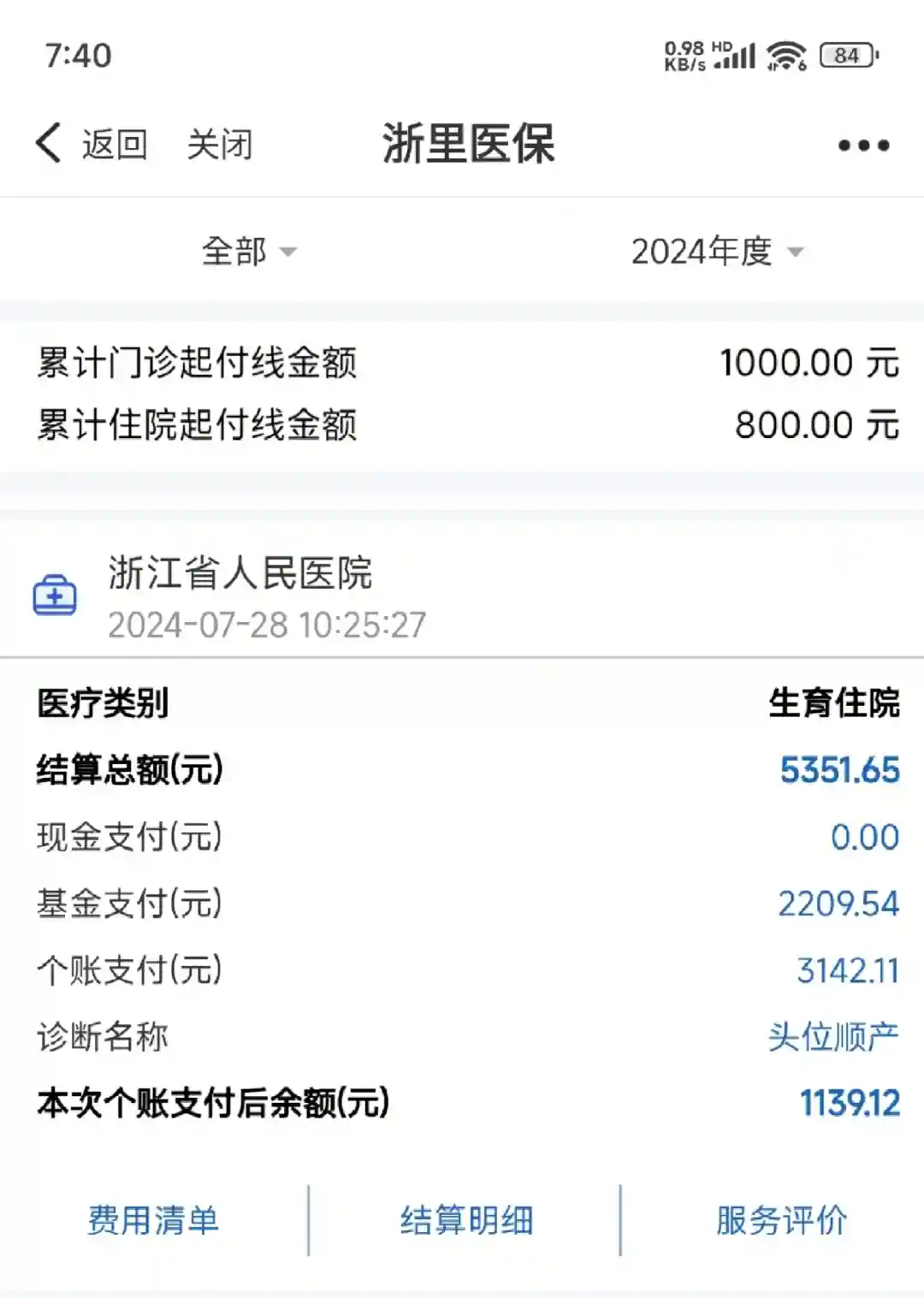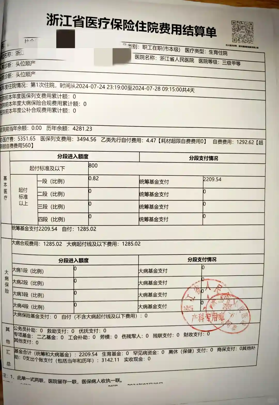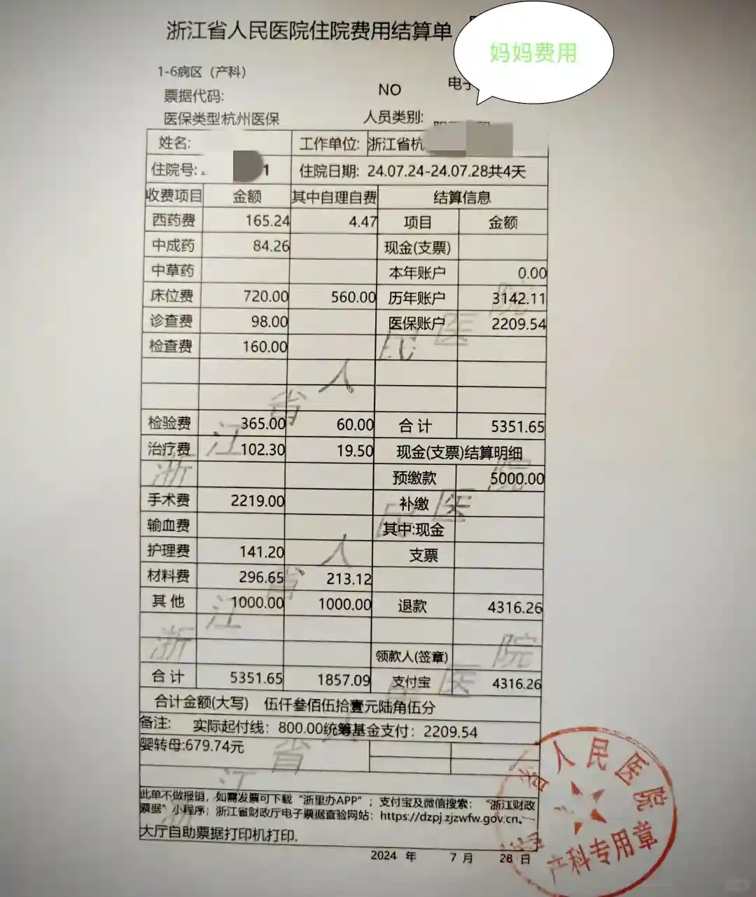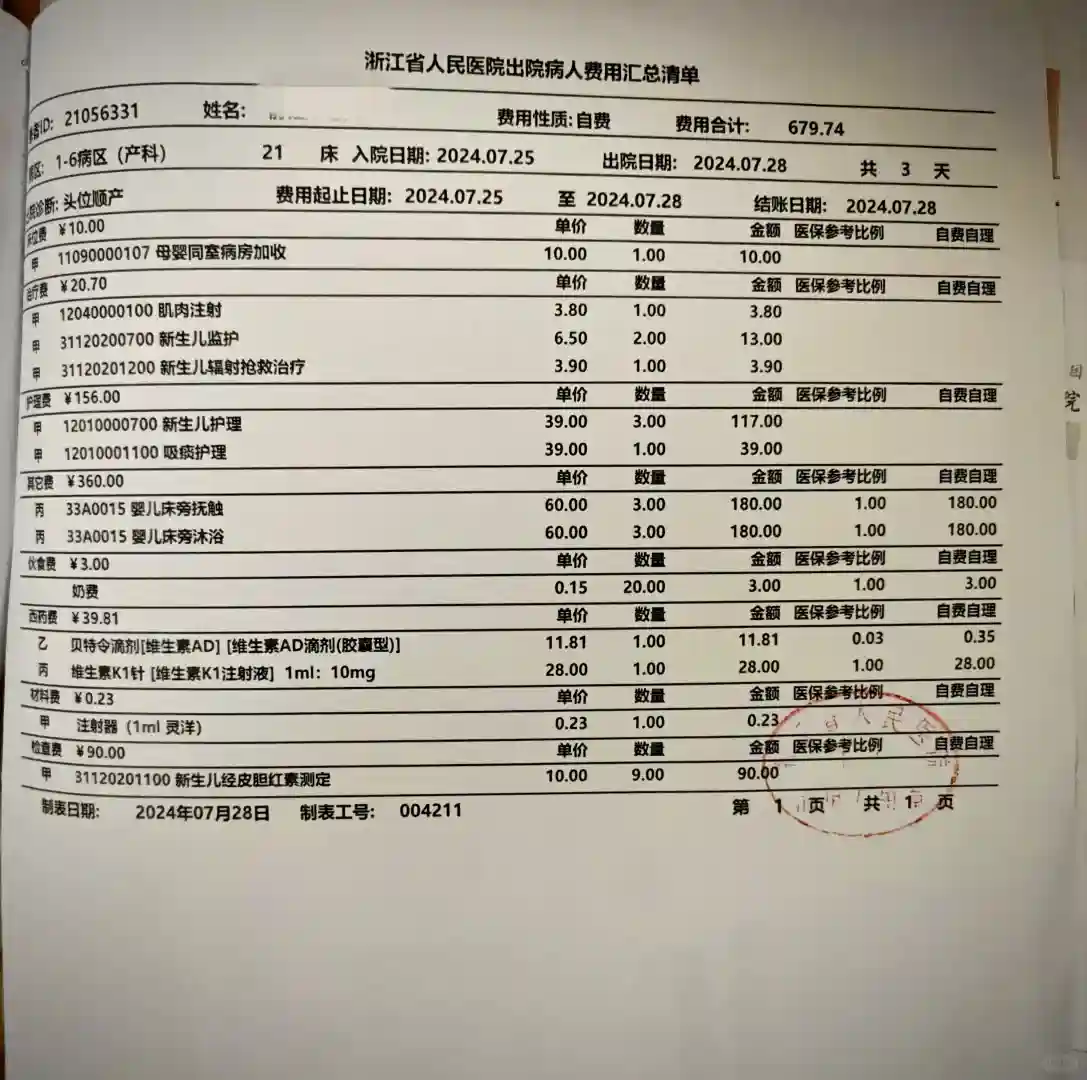我的情况:单胎顺产,住院4天,花费5351(妈妈费用)+679(宝宝费用)+720(护工费用),总共6750元。其中统筹基金支付2209元,实际自费4541元。
