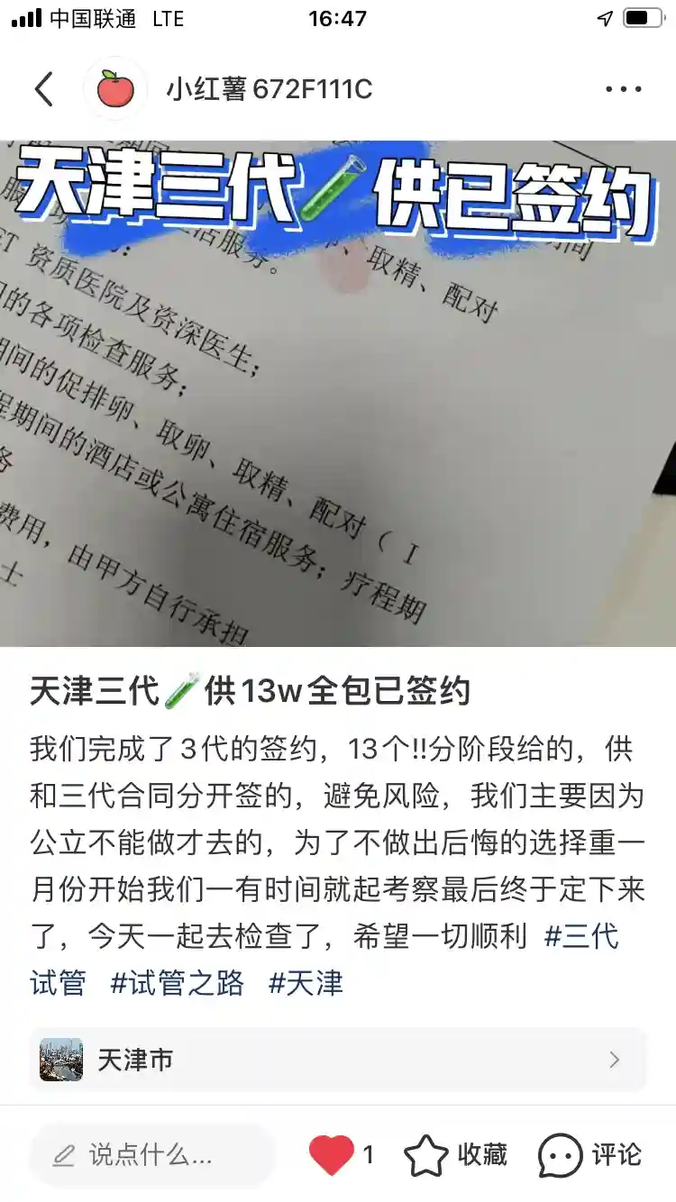 首先,我确实是签的在天津这边的,之前也去其他地方看过,都没什么用,钱倒是乱花了十几万了,我为什么知道这个地方有呢,是之前前我家里人也是在这里做的的,当时她四五年了没有怀上,加上是二婚,年纪也有点大了,经过多方打探才知道现在的位置的,