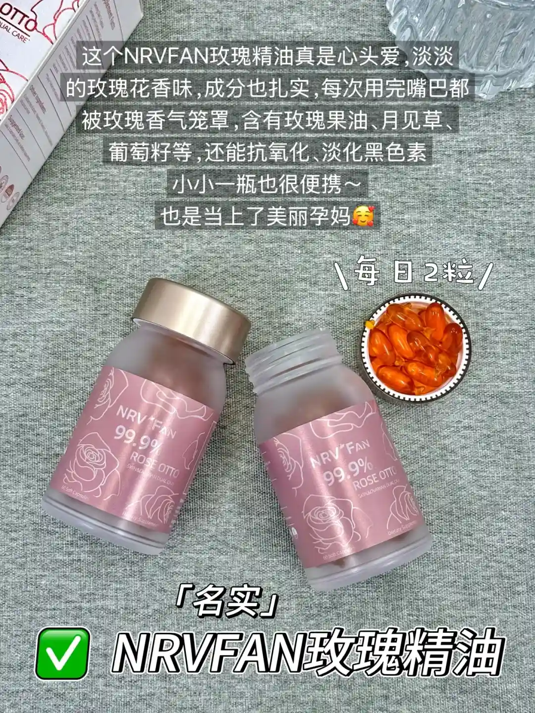 这个(名实)NRVFAN玫瑰精油真是心头爱,淡淡的玫瑰香味,每次用完嘴巴都被玫瑰香气笼罩,成分扎实,每颗含量都很足,含有玫瑰果油和月见草、葡萄籽油等,还能抗氧化、淡化黑色素,小小一瓶也很便携~也是当上了美丽孕妈🥰