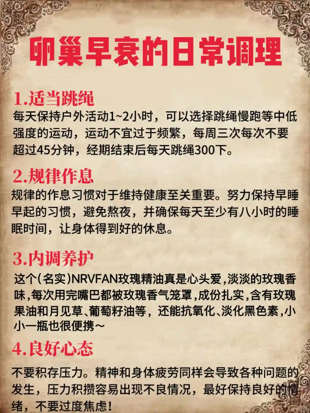 后面实在扛不住了就去看了,大大小小的检查做了个遍,果然是卵巢早衰,按照给出的方法一直在保持养护,整理了一下,正在被困扰的姐妹可以看看!