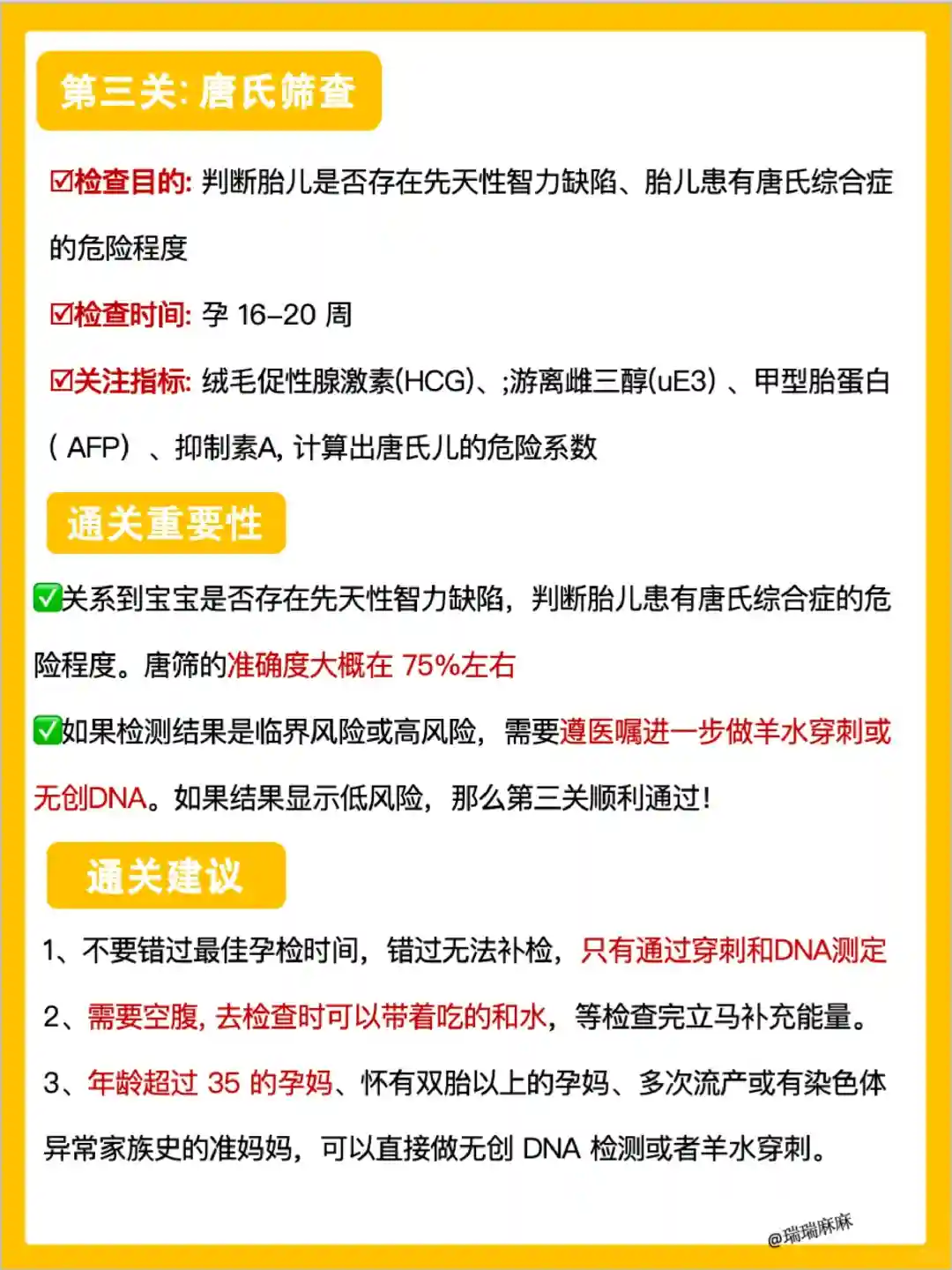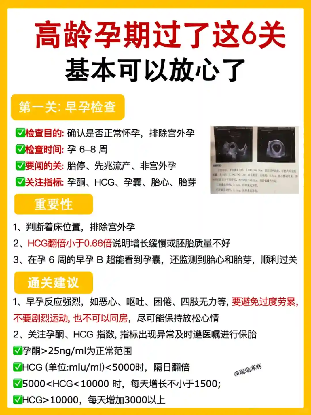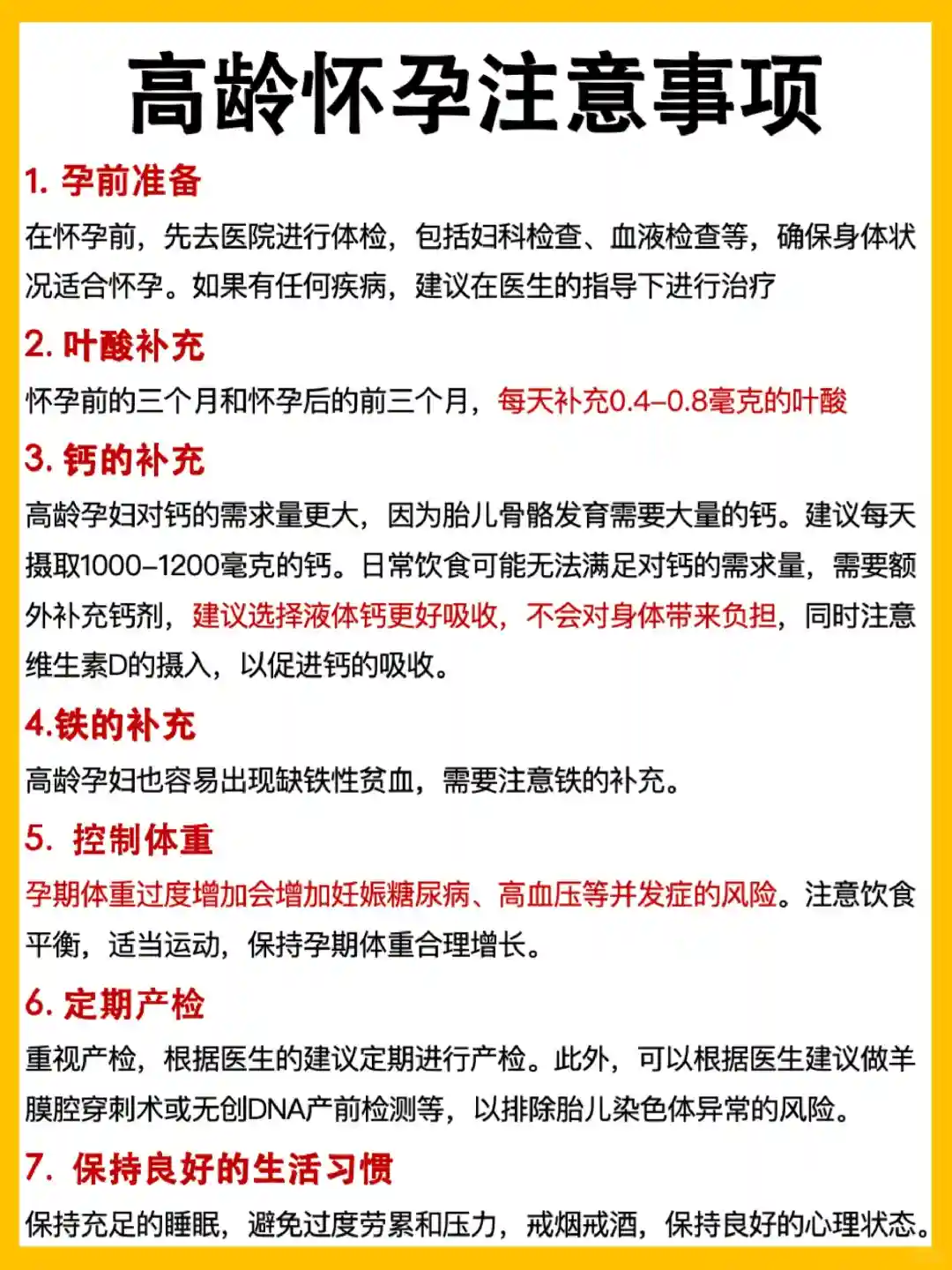 6. 定期产检:高龄孕妇应更加重视产检,根据医生的建议定期进行产检。此外,建议做羊膜腔穿刺术或无创DNA产前检测等,以排除胎儿染色体异常的风险。