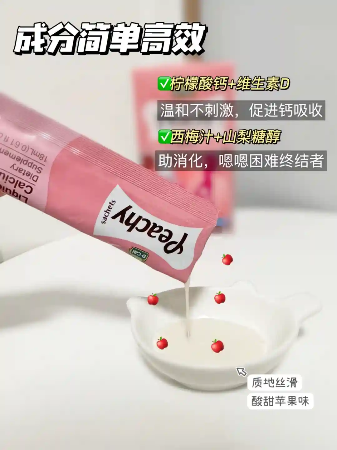 二胎的时候,闺蜜就送了这个迪巧小粉条液体钙给我,它是液体的,喝起来特别方便,酸酸甜甜的苹果味,像酸奶质地,很丝滑超好喝,每条有500mg的钙和600iu的vd,能有效促进钙吸收提高40%,相当于一次吃了两三粒大钙片,里面添加了西梅汁山梨糖醇,对孕期噗噗困难的,真的很友好。独立包装,一次一条满足日常所需,超级方便!
