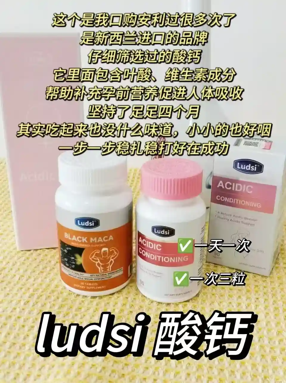 觉得食补比较慢,不够到位的妈妈可以选择适合自己的一款酸性营养剂很有必要,👉ludsi酸钙 这款里有备孕期间所需的酸性营养成分,里面的活性叶酸能提供准妈妈孕前所需营养,每天三粒,温水吞服~🥰