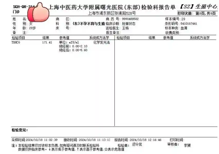 第二个女生34岁,平时月经不规律,有排卵障碍。促排卵指导同房2周期,人工授精一次都未孕。2024年9月在我这里转试管,取卵18枚,配成1枚D3冻胚,9枚囊胚。9月30日第一次移植,移植1枚超优质的囊胚,今天验孕成功还有9个胚胎在我这里,真妥妥的生育力保存